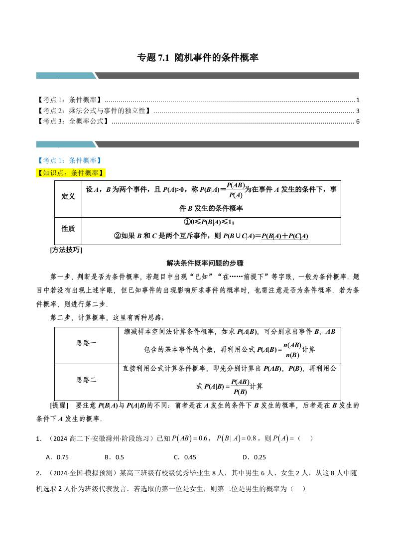 专题7.1 随机事件的条件概率(3类必考点)(人教A版选择性必修第三册)(学生版)