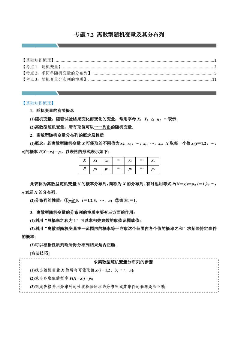 专题7.2 离散型随机变量及其分布列(3类必考点)(人教A版选择性必修第三册)(教师版)