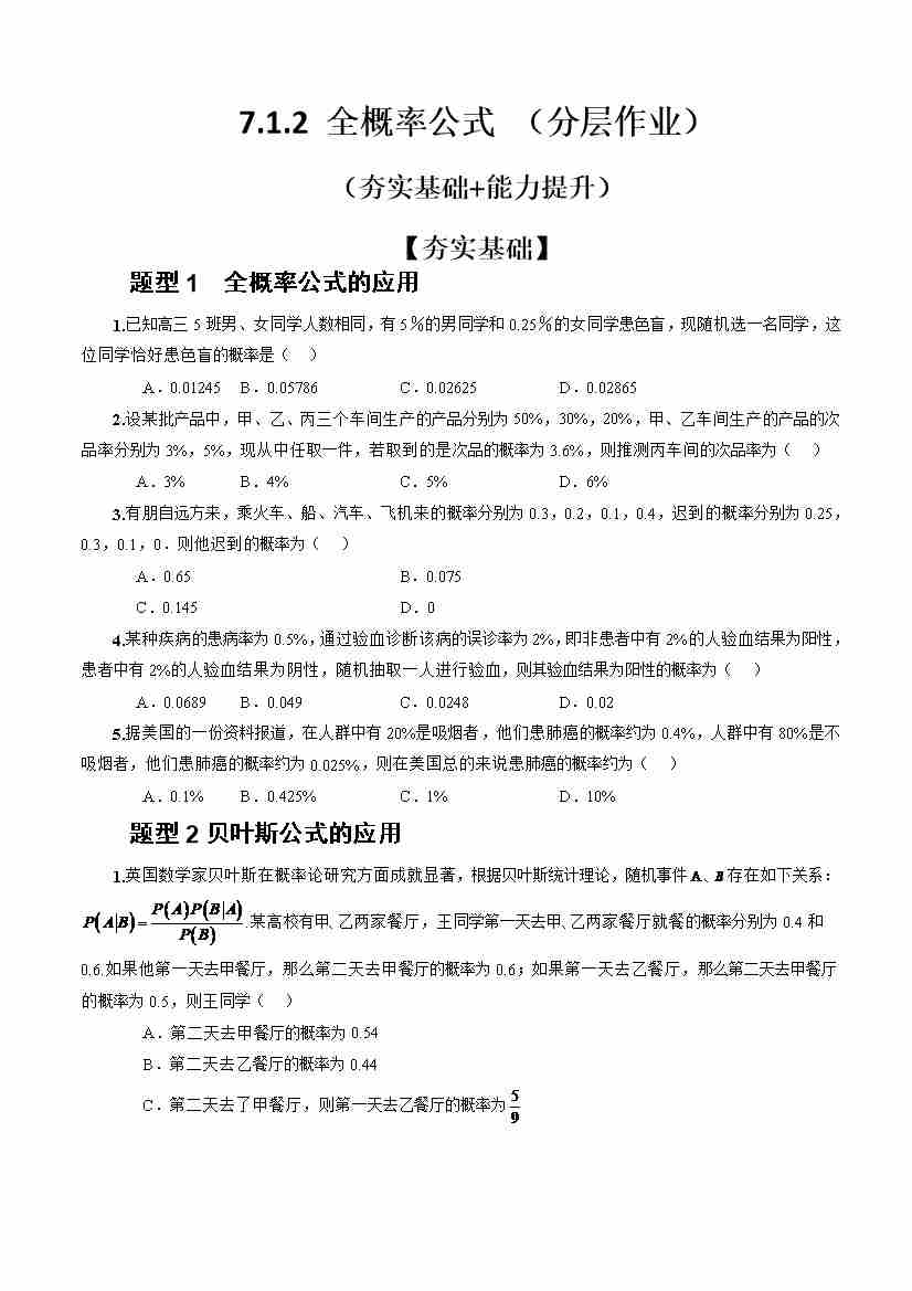 7.1.2 全概率公式(分层作业)(原卷版)