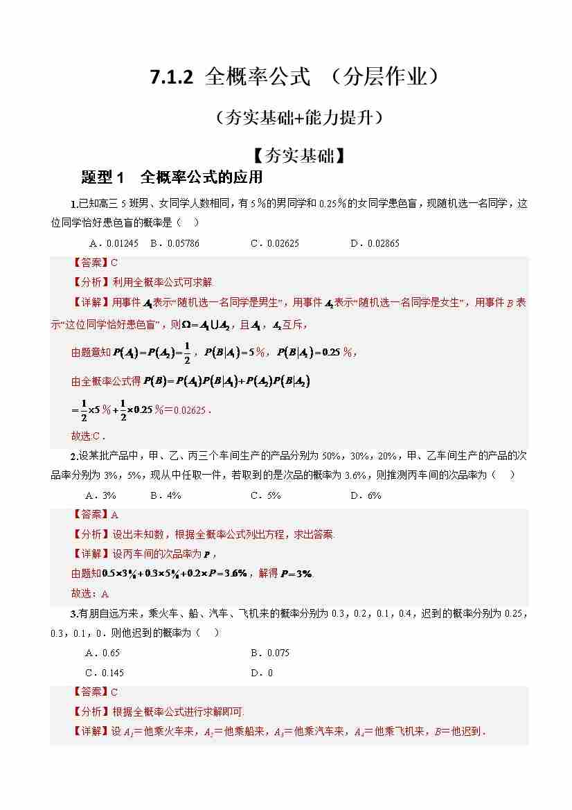 7.1.2 全概率公式(分层作业)(解析版)