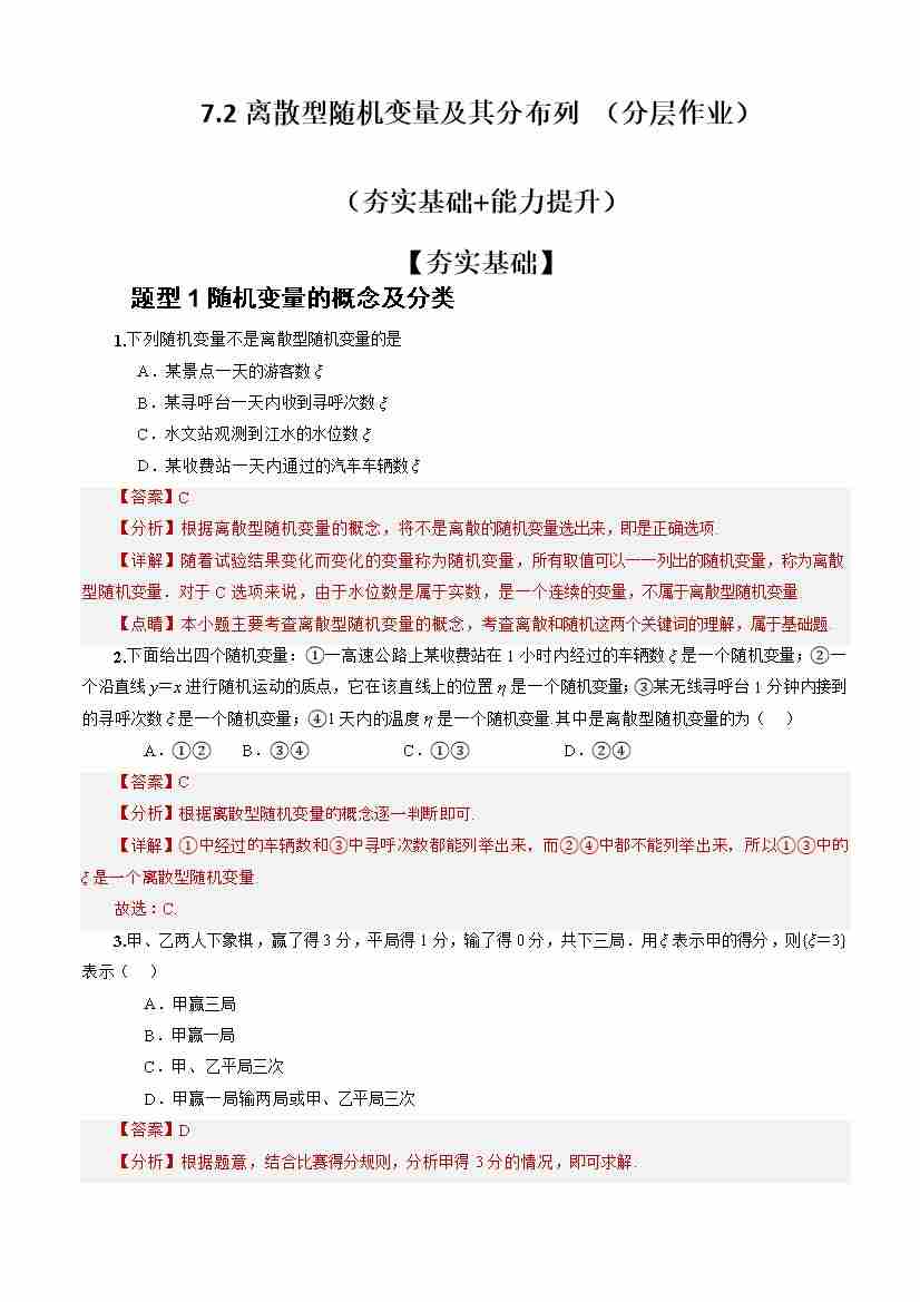 7.2离散型随机变量及其分布列 (分层作业)(解析版)