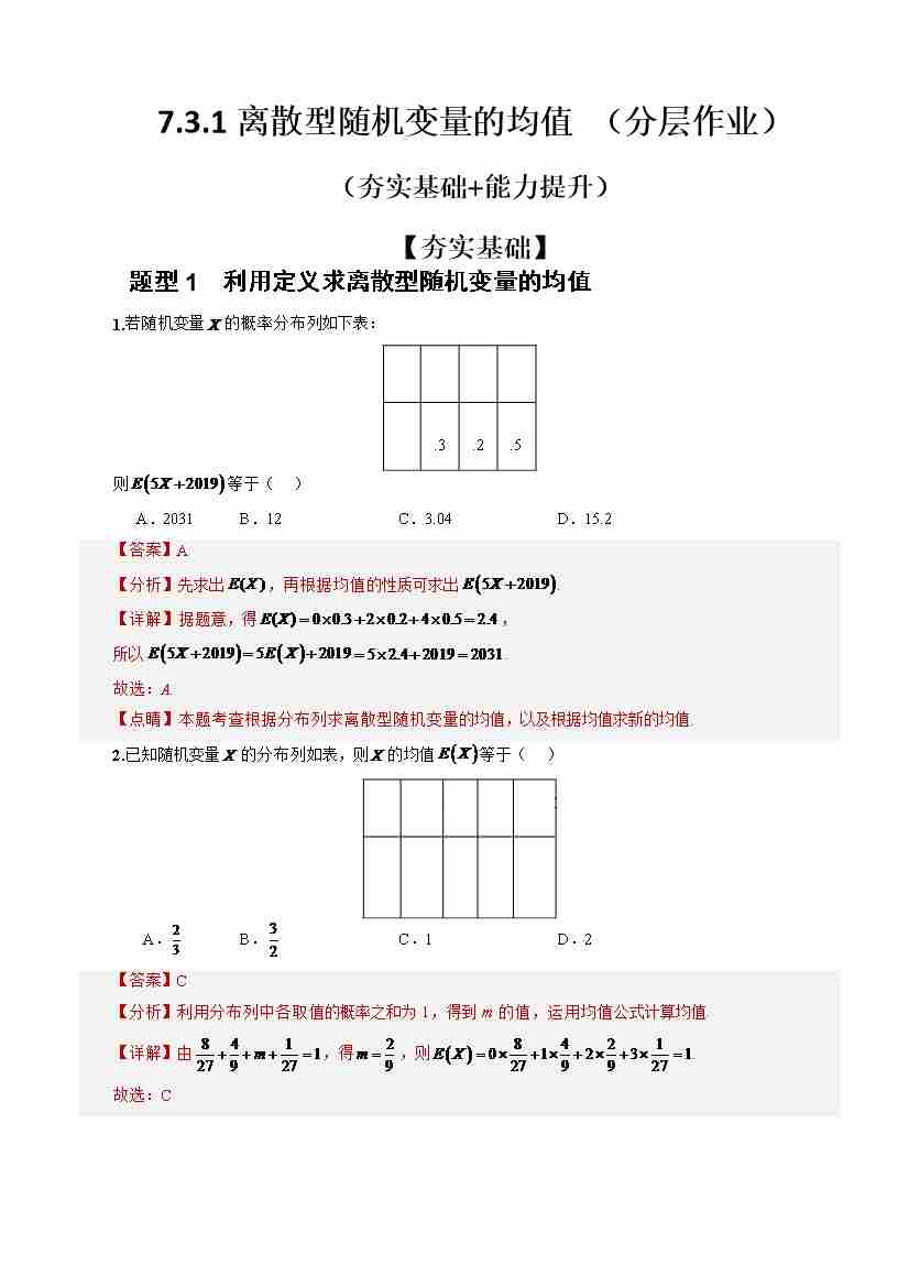 7.3.1离散型随机变量的均值(分层作业)(解析版)