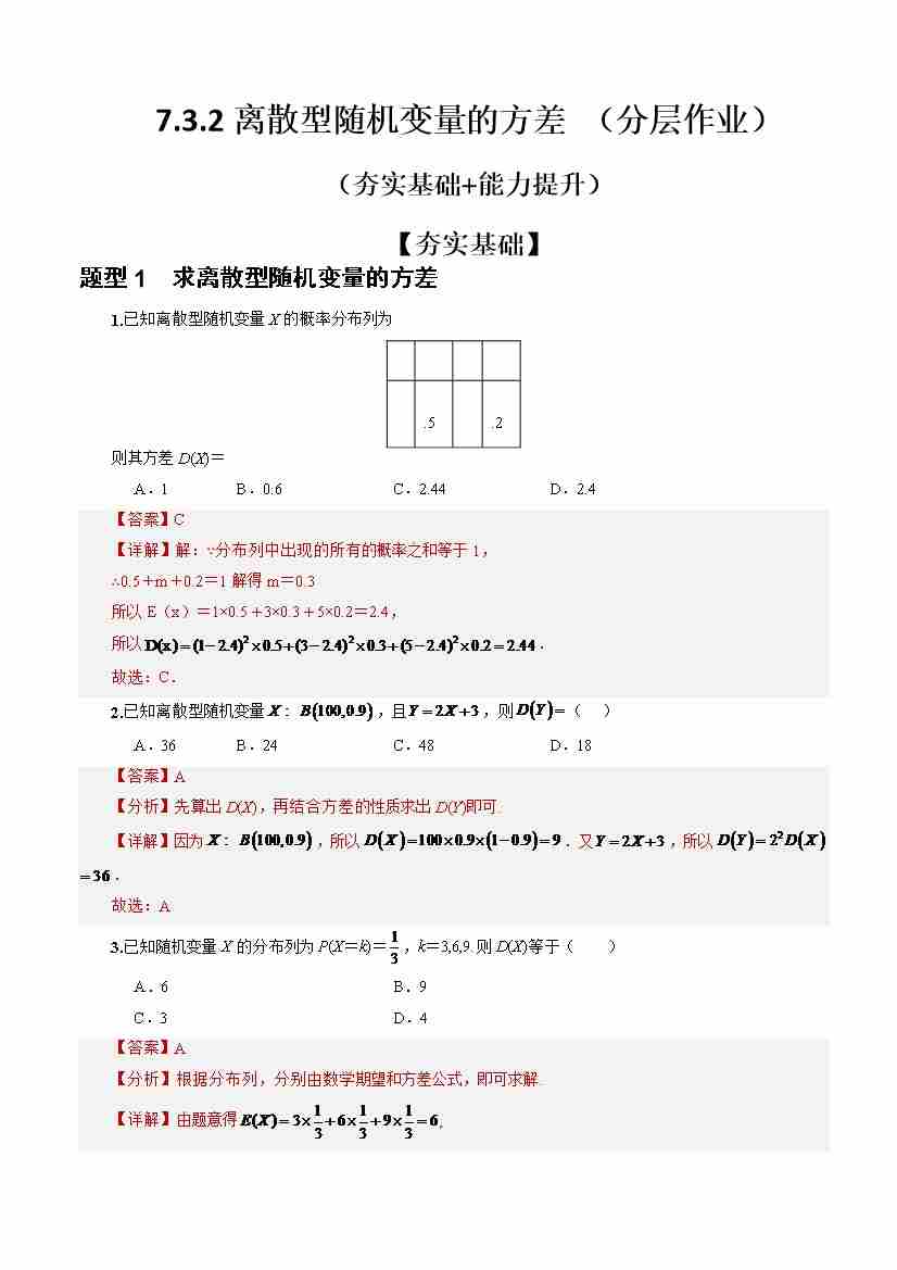 7.3.2离散型随机变量的方差 (分层作业)(解析版)