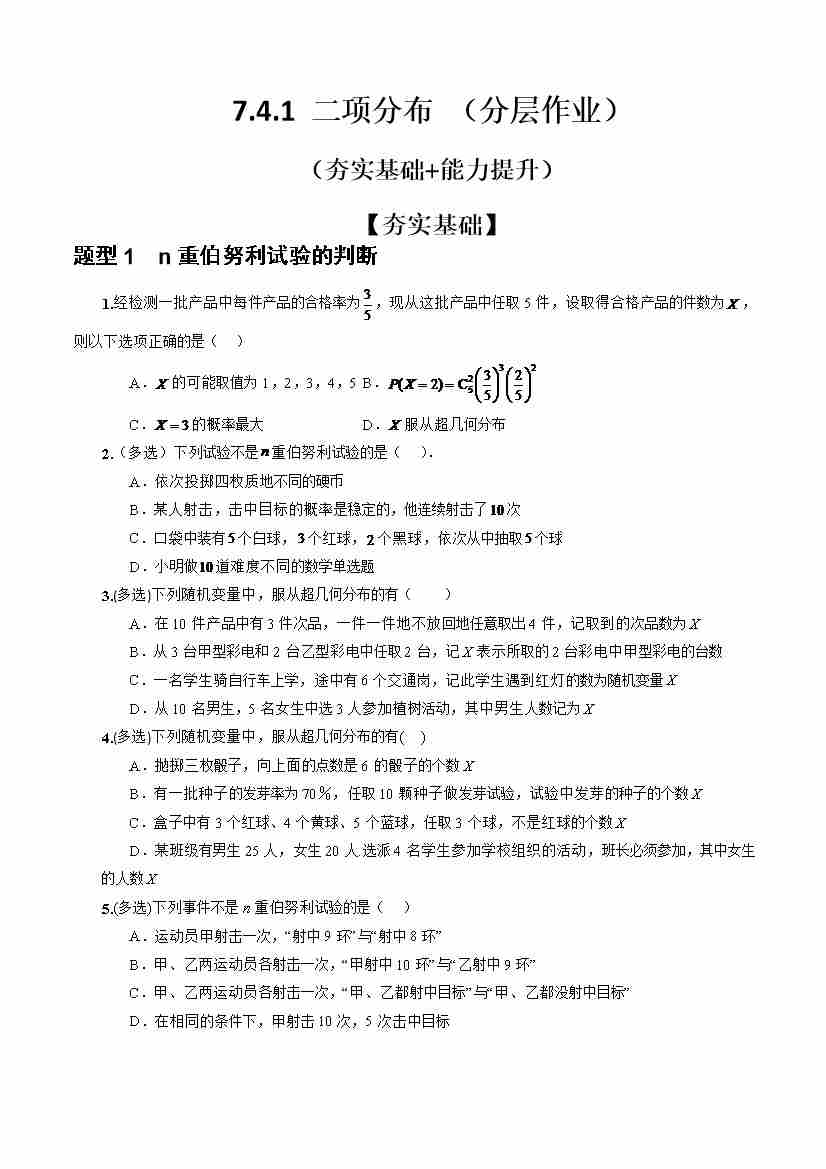 7.4.1 二项分布 (分层作业)(原卷版)