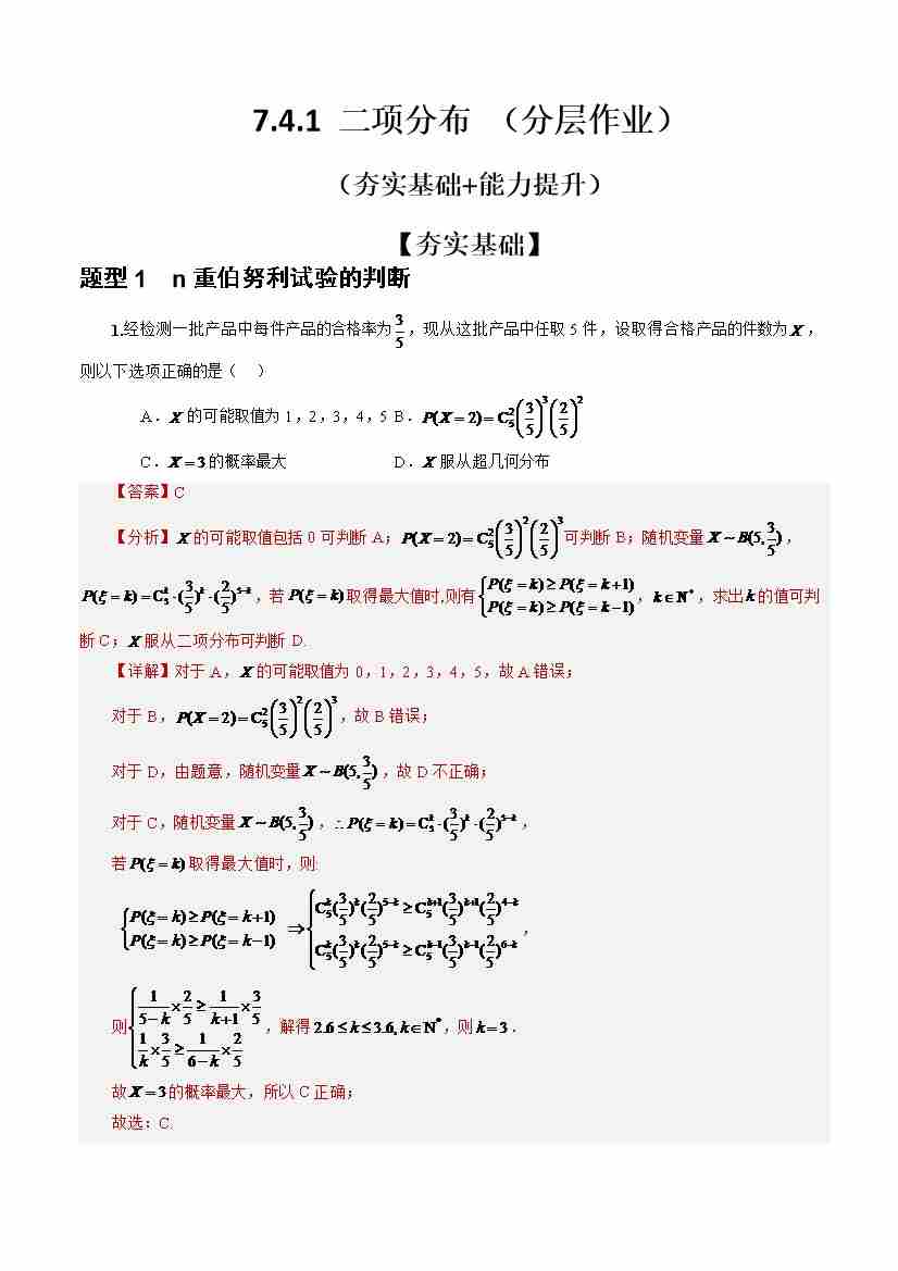 7.4.1 二项分布 (分层作业)(解析版)
