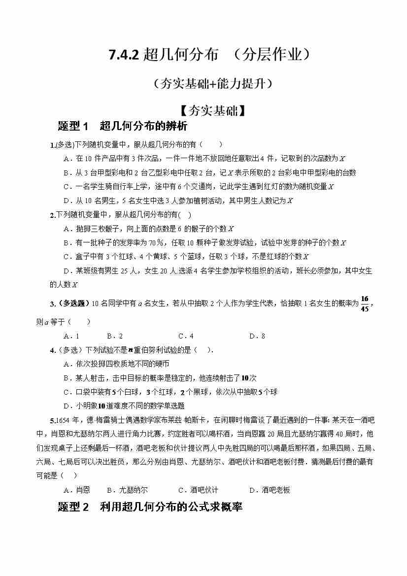 7.4.2超几何分布 (分层作业)(原卷版)