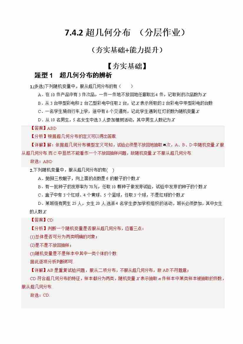 7.4.2超几何分布 (分层作业)(解析版)