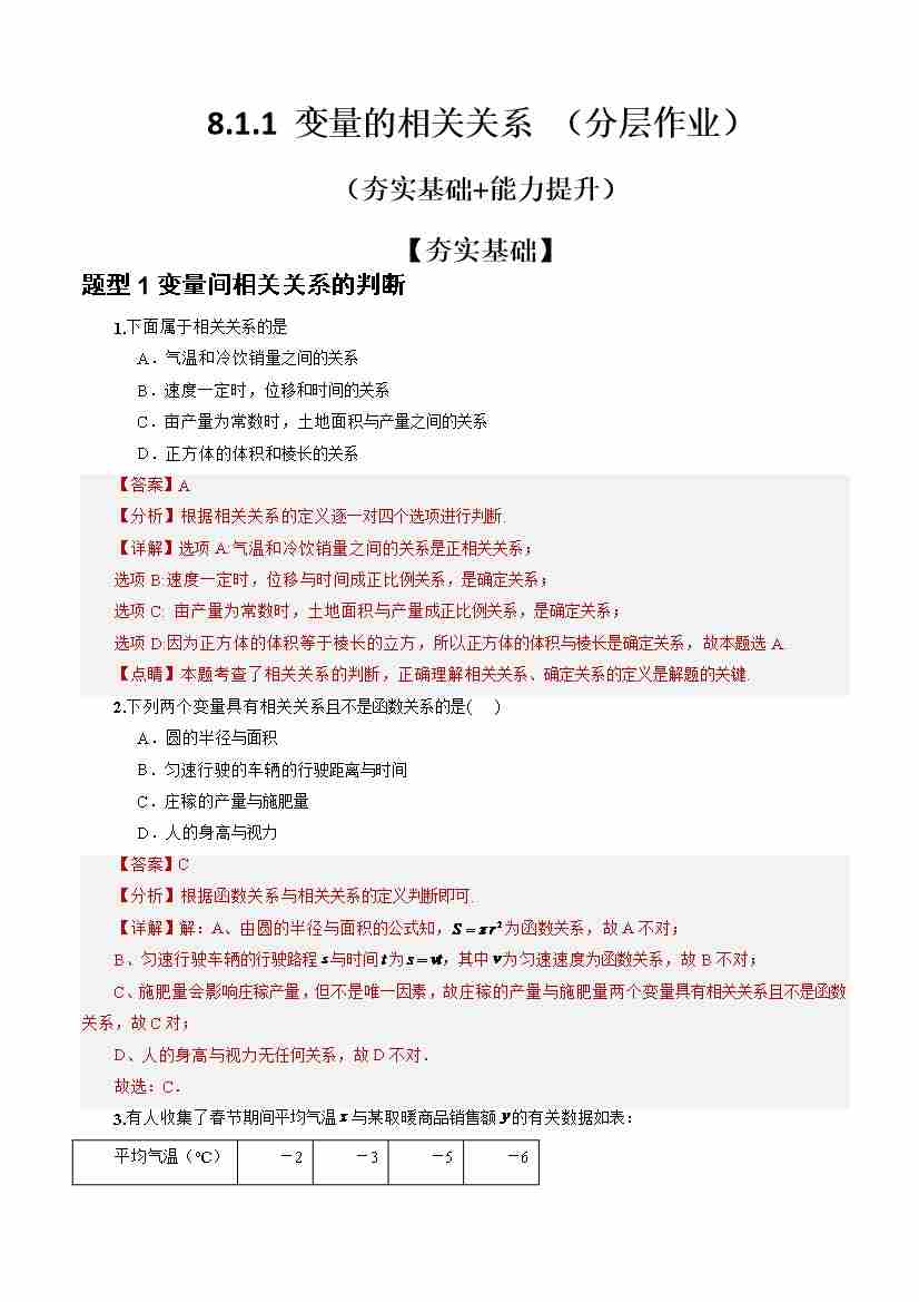 8.1.1 变量的相关关系(分层作业)(解析版)