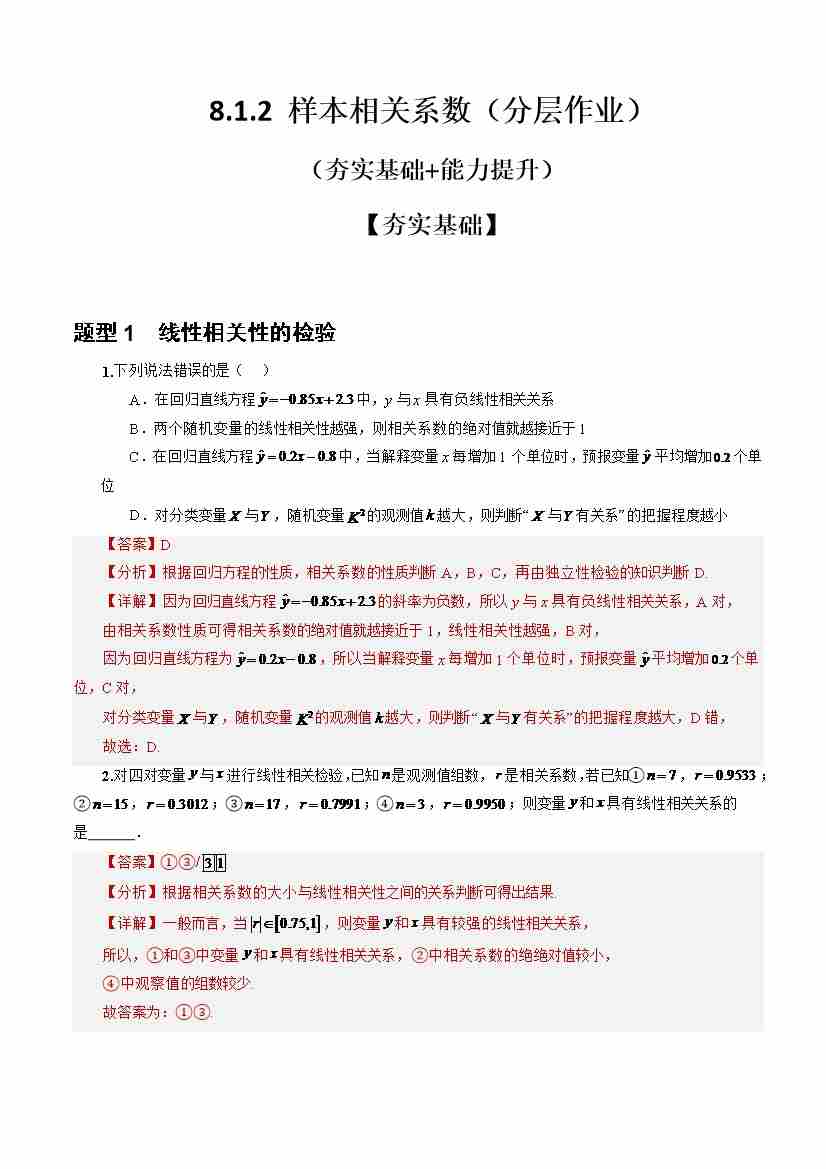 8.1.2 样本相关系数(分层作业)(解析版)