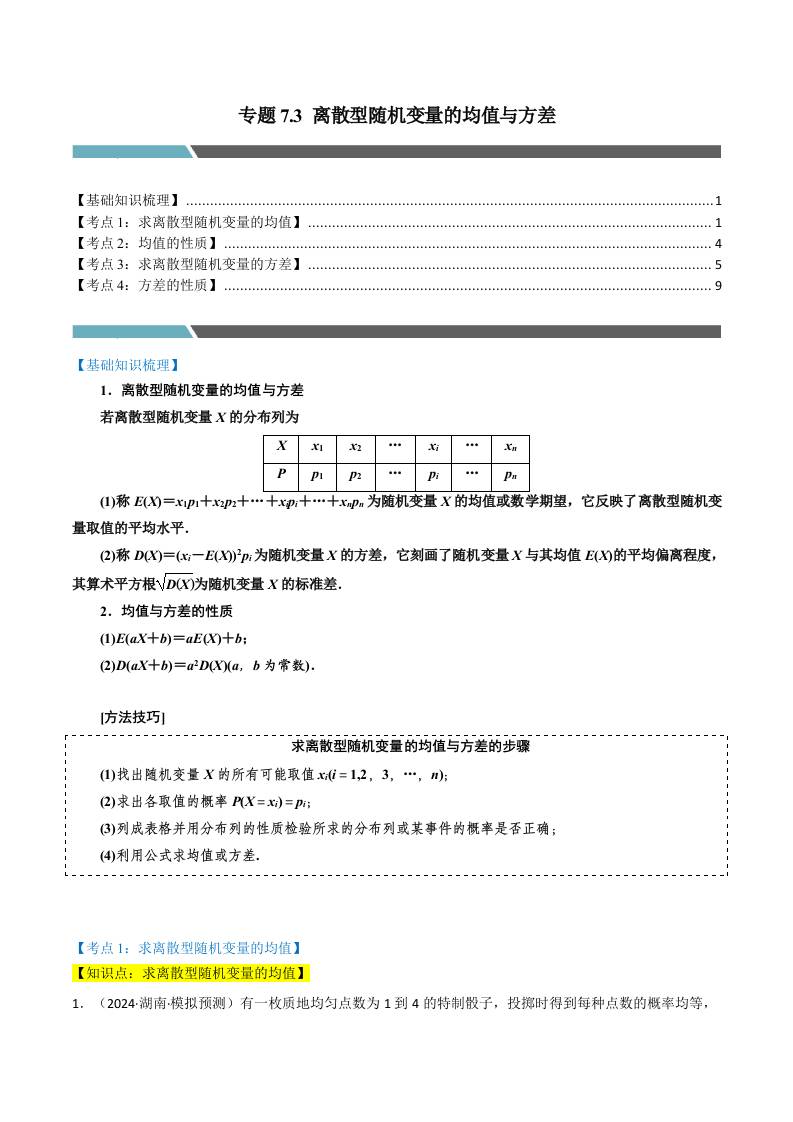 专题7.3 离散型随机变量的均值与方差(4类必考点)(人教A版选择性必修第三册)(学生版)
