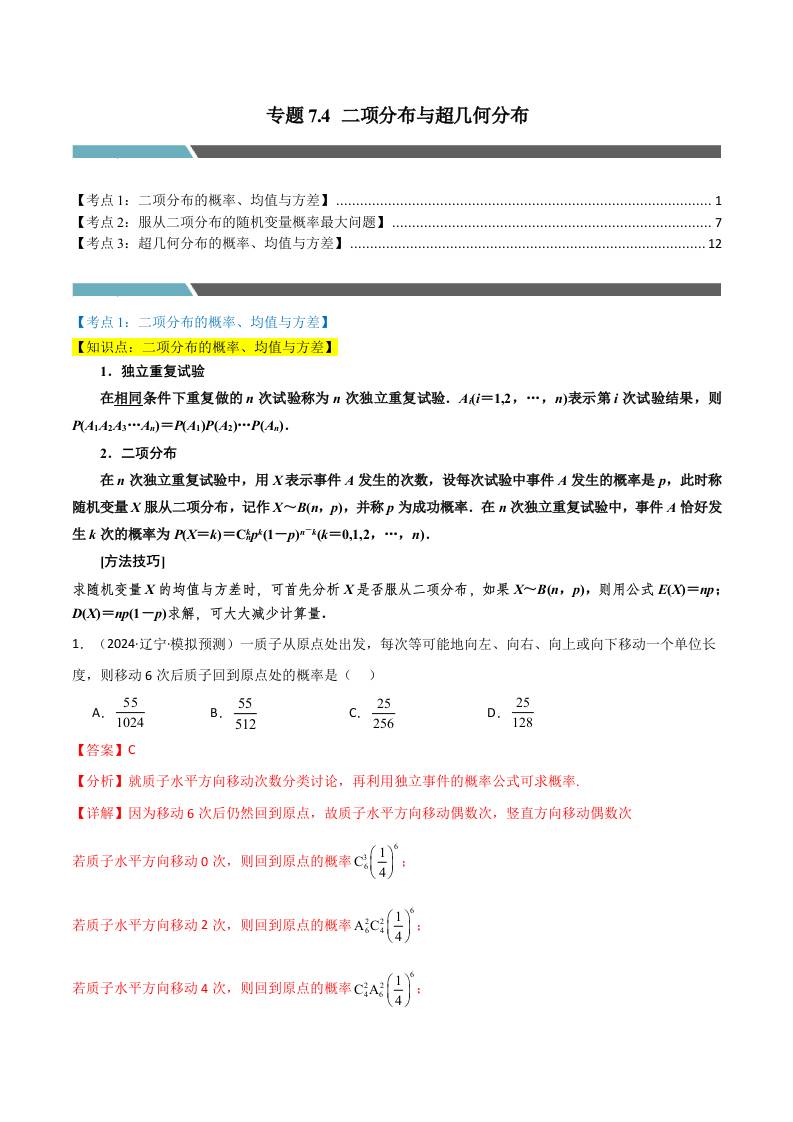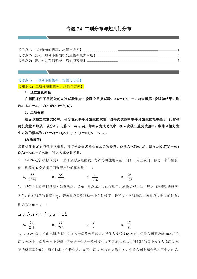 专题7.4 二项分布与超几何分布(3类必考点)(人教A版选择性必修第三册)(学生版)