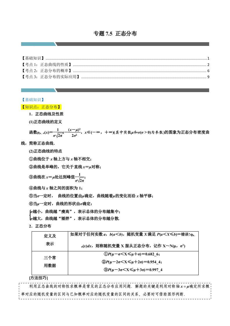 专题7.5 正态分布(3类必考点)(人教A版选择性必修第三册)(学生版)