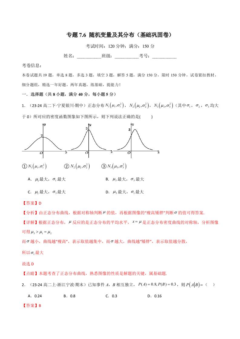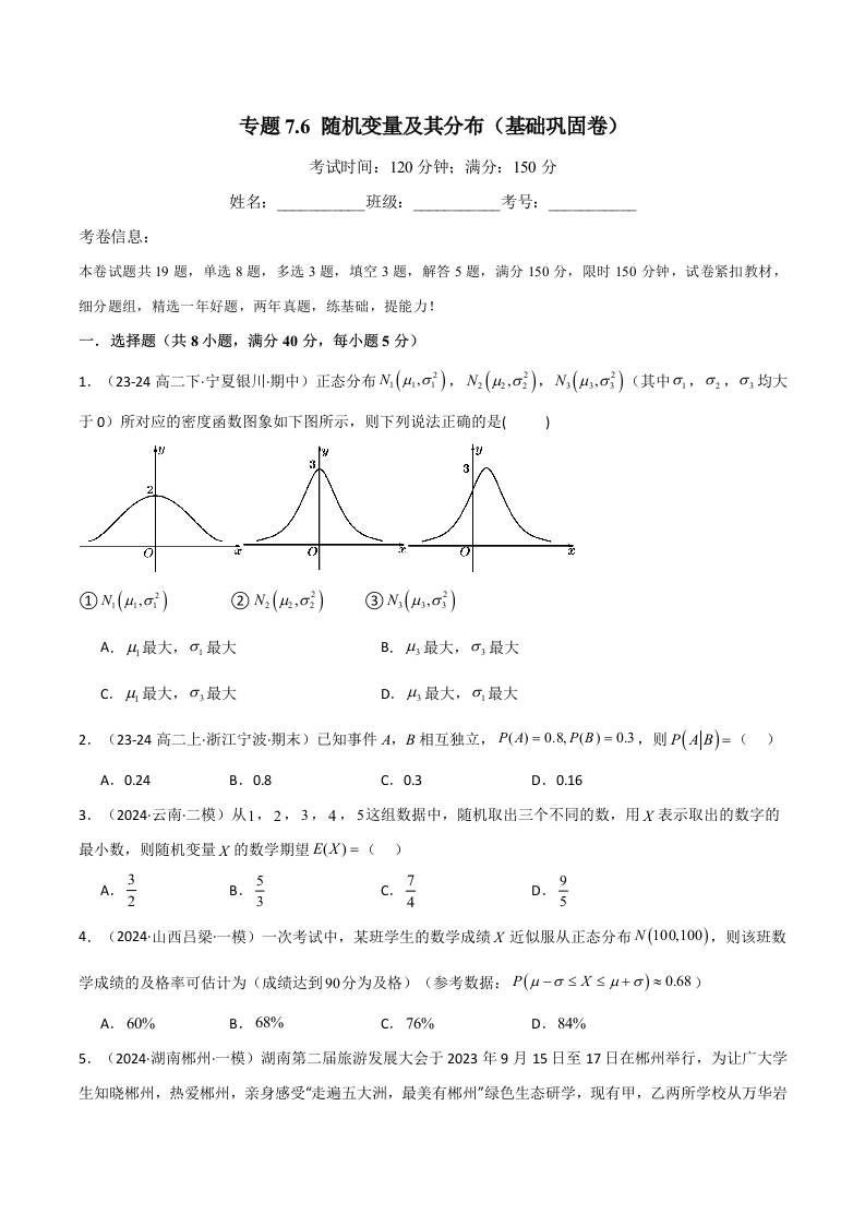 专题7.6 随机变量及其分布(基础巩固卷)(人教A版选择性必修第三册)(学生版)