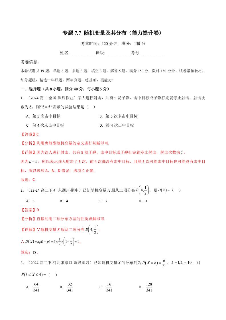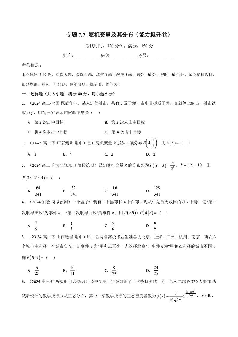 专题7.7 随机变量及其分布(能力提升卷)(人教A版选择性必修第三册)(学生版)