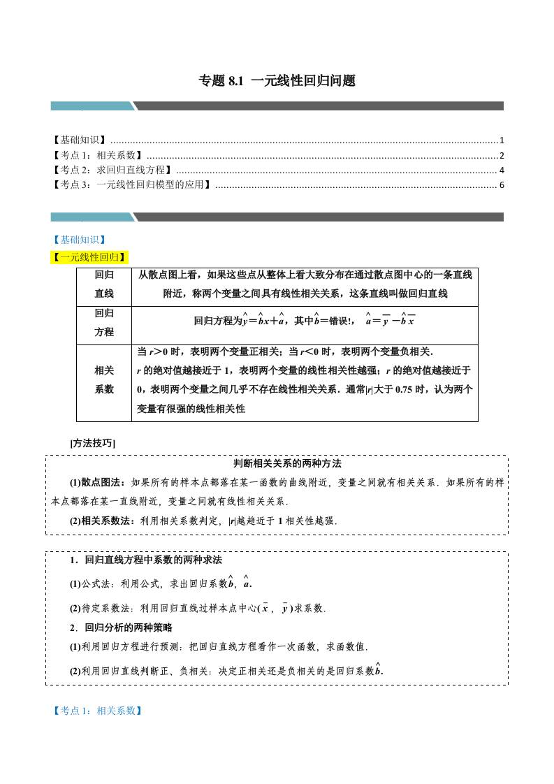专题8.1 一元线性回归问题(3类必考点)(人教A版选择性必修第三册)(教师版)