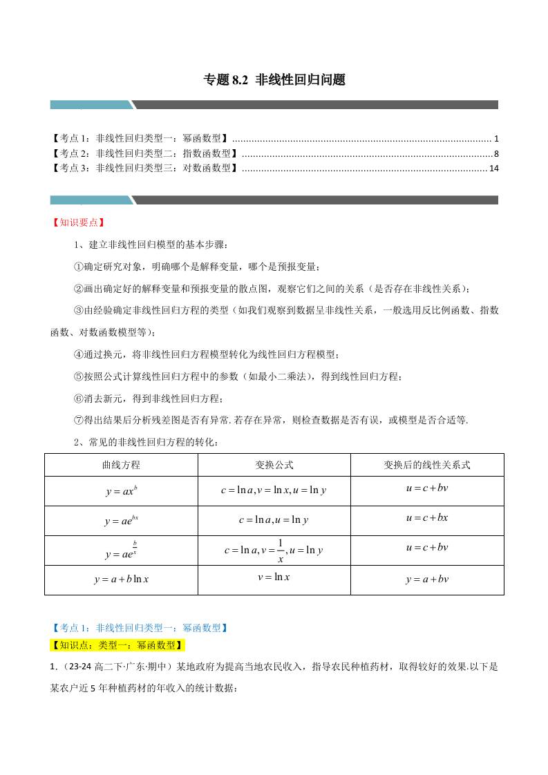 专题8.2 非线性回归问题(3类必考点)(人教A版选择性必修第三册)(教师版)