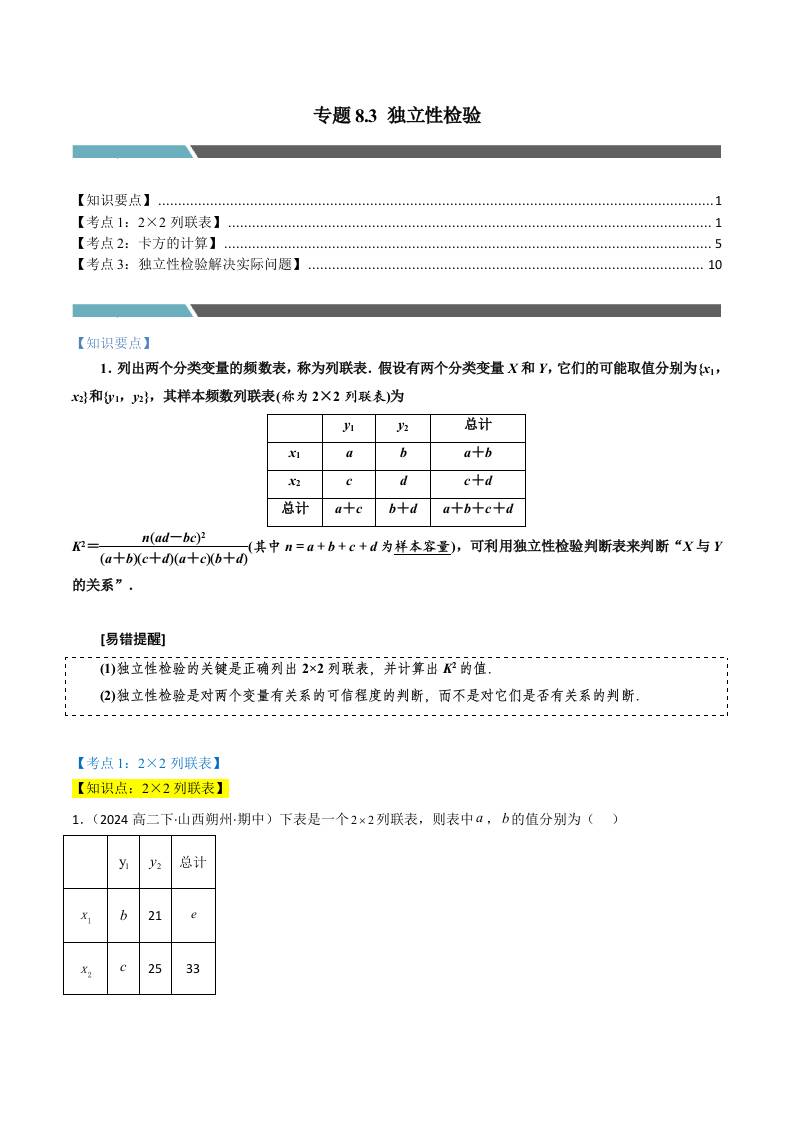 专题8.3 独立性检验(3类必考点)(人教A版选择性必修第三册)(学生版)