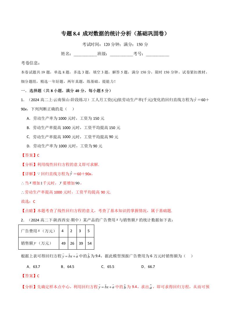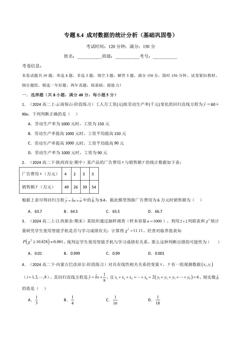 专题8.4 成对数据的统计分析(基础巩固卷)(人教A版选择性必修第三册)(学生版)