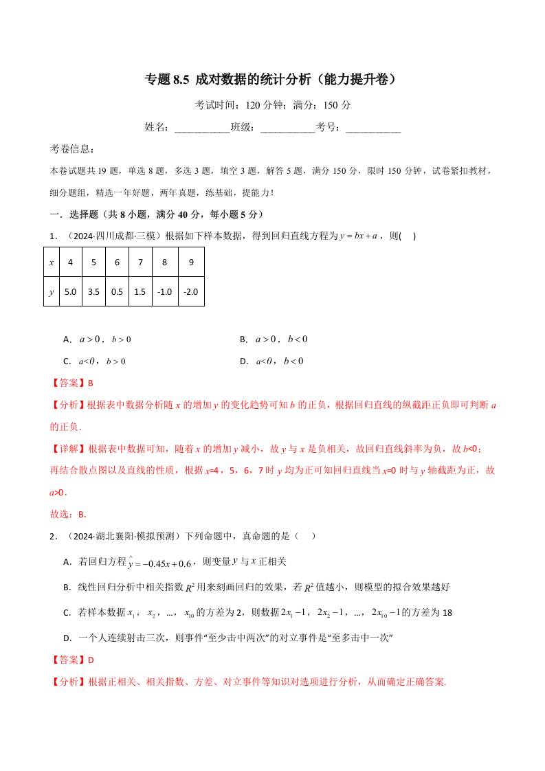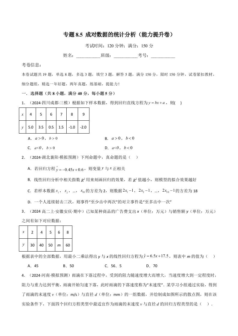 专题8.5 成对数据的统计分析(能力提升卷)(人教A版选择性必修第三册)(学生版)