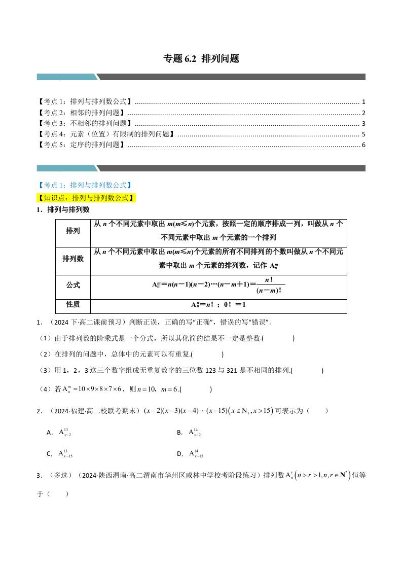 专题6.2 排列问题(5类必考点)(人教A版选择性必修第三册)(学生版)