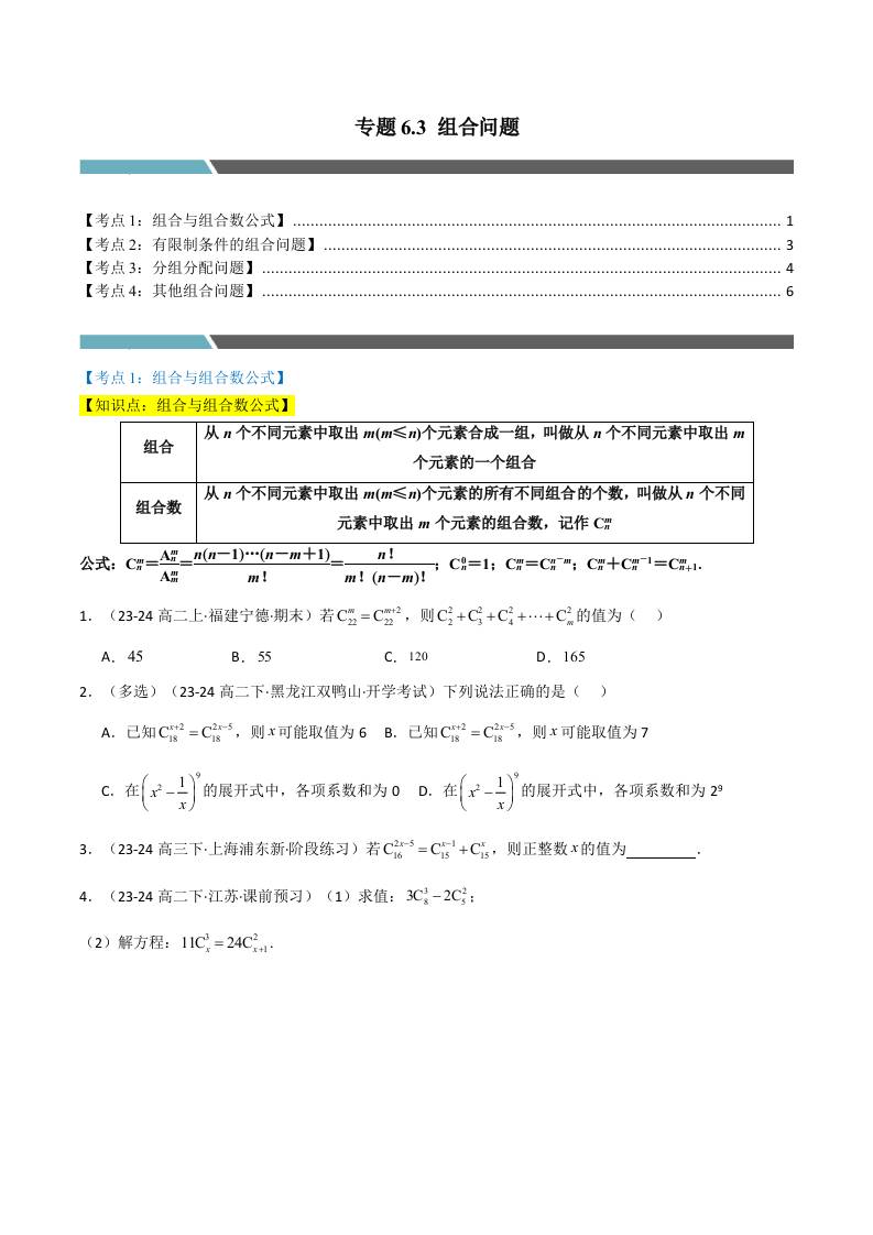 专题6.3 组合问题(4类必考点)(人教A版选择性必修第三册)(学生版)