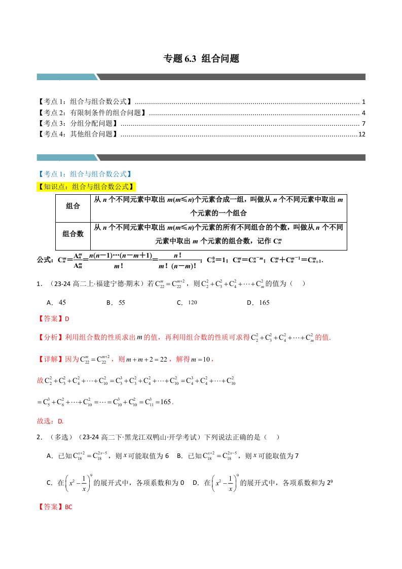 专题6.3 组合问题(4类必考点)(人教A版选择性必修第三册)(教师版)
