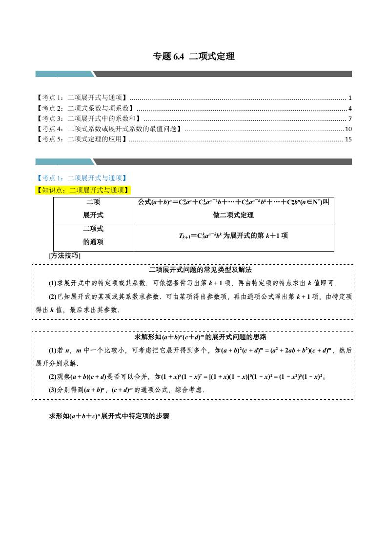 专题6.4 二项式定理(5类必考点)(人教A版选择性必修第三册)(学生版)