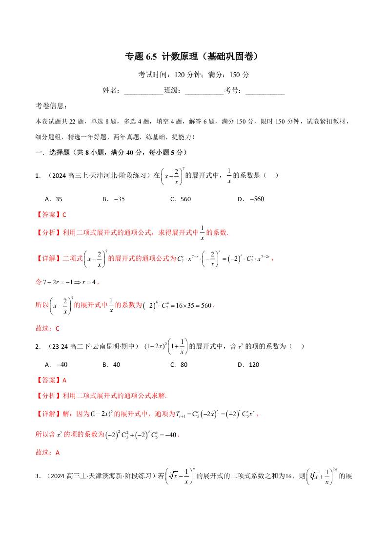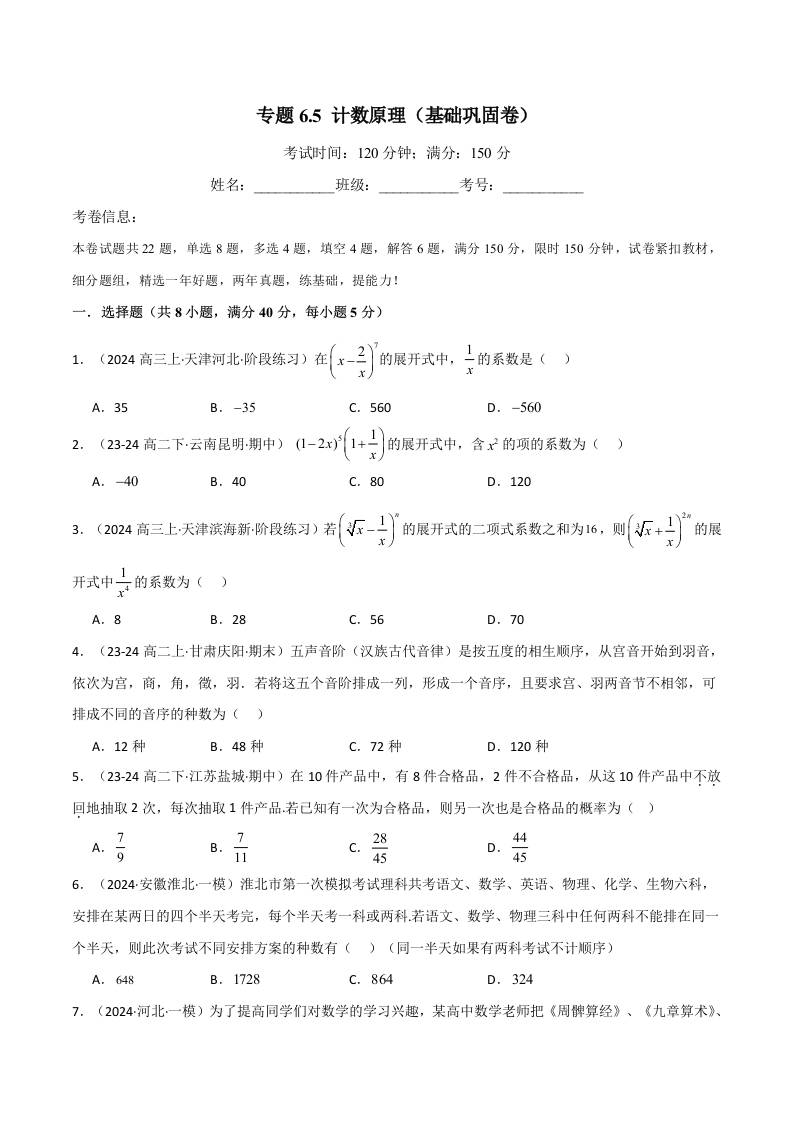 专题6.5 计数原理(基础巩固卷)(人教A版选择性必修第三册)(学生版)