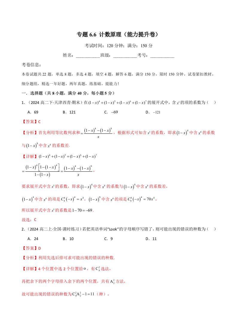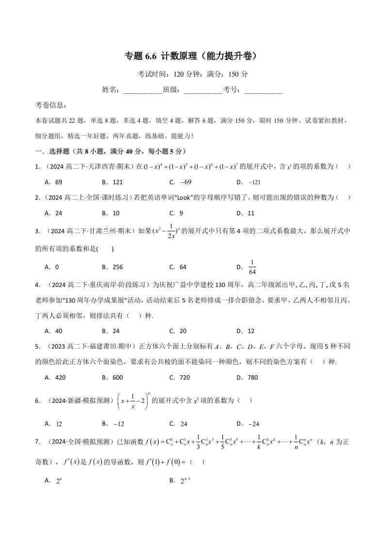 专题6.6 计数原理(能力提升卷)(人教A版选择性必修第三册)(学生版)