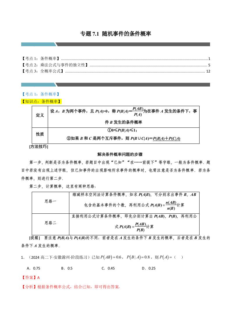 专题7.1 随机事件的条件概率(3类必考点)(人教A版选择性必修第三册)(教师版)