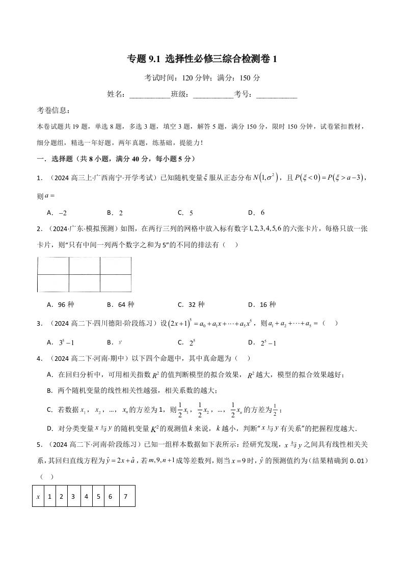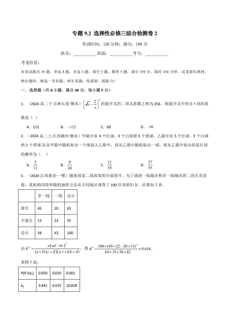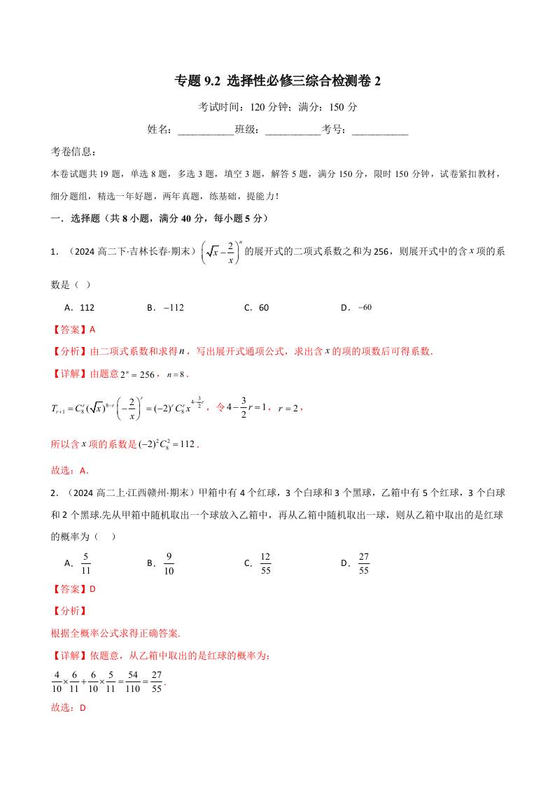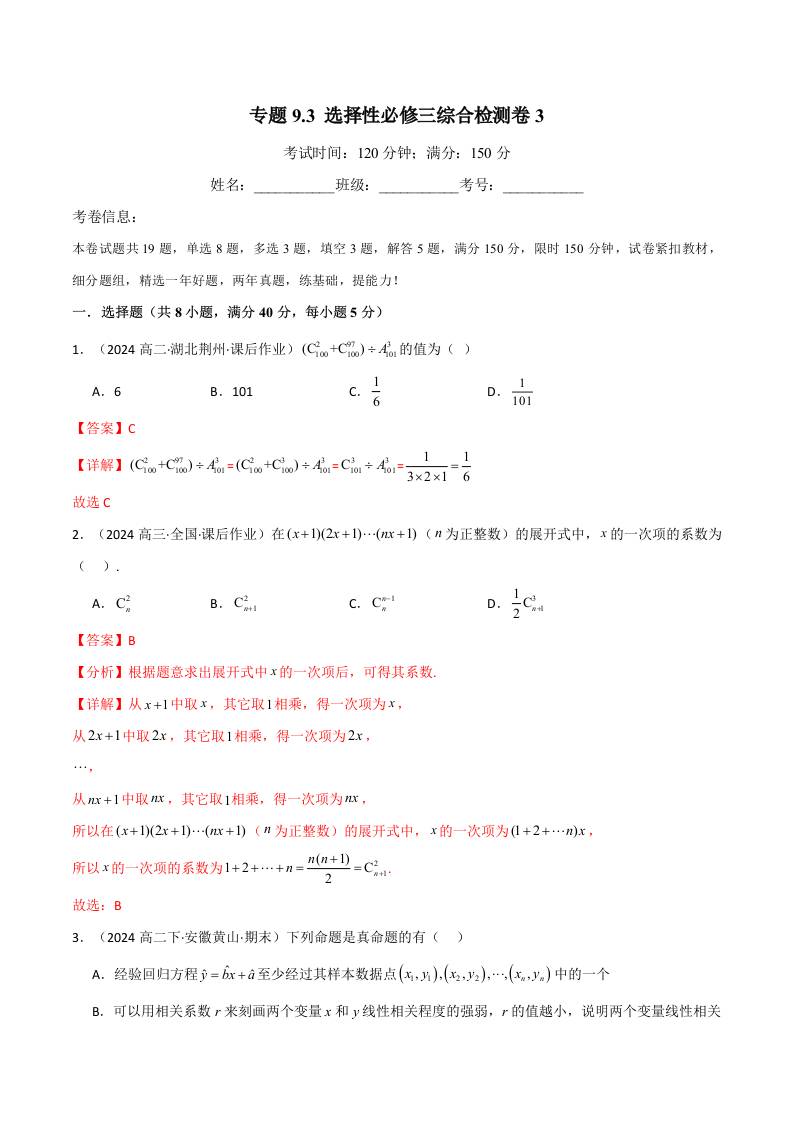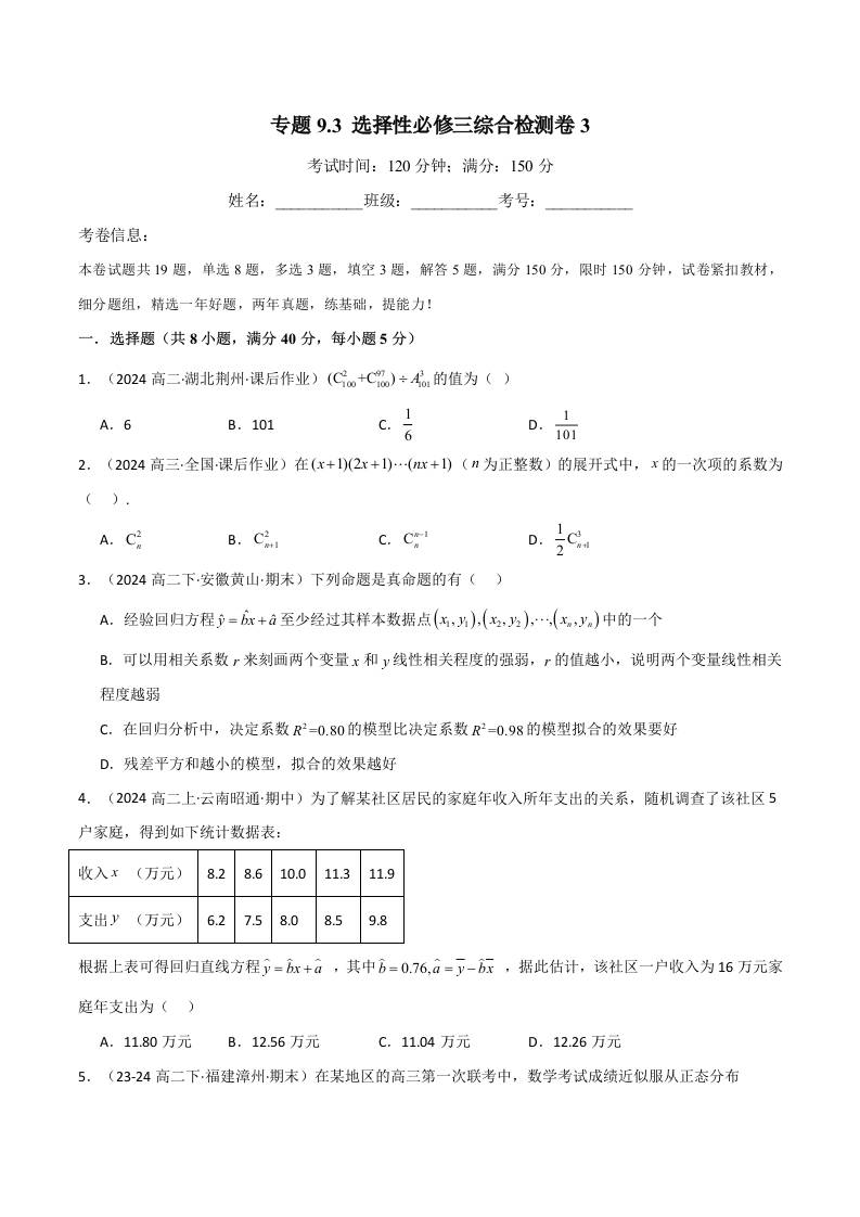 专题9.1 选择性必修第三册综合检测卷1(人教A版)(学生版)