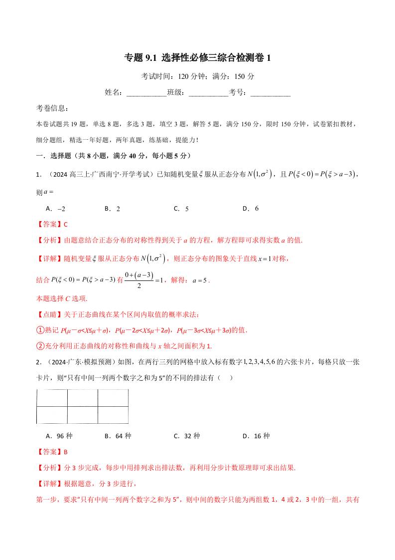 专题9.1 选择性必修第三册综合检测卷1(人教A版)(教师版)