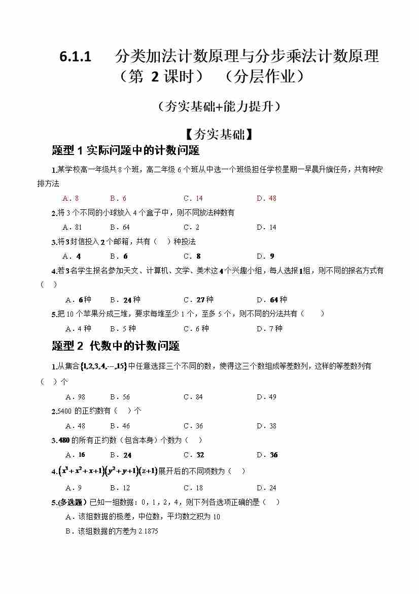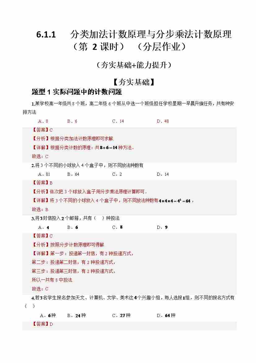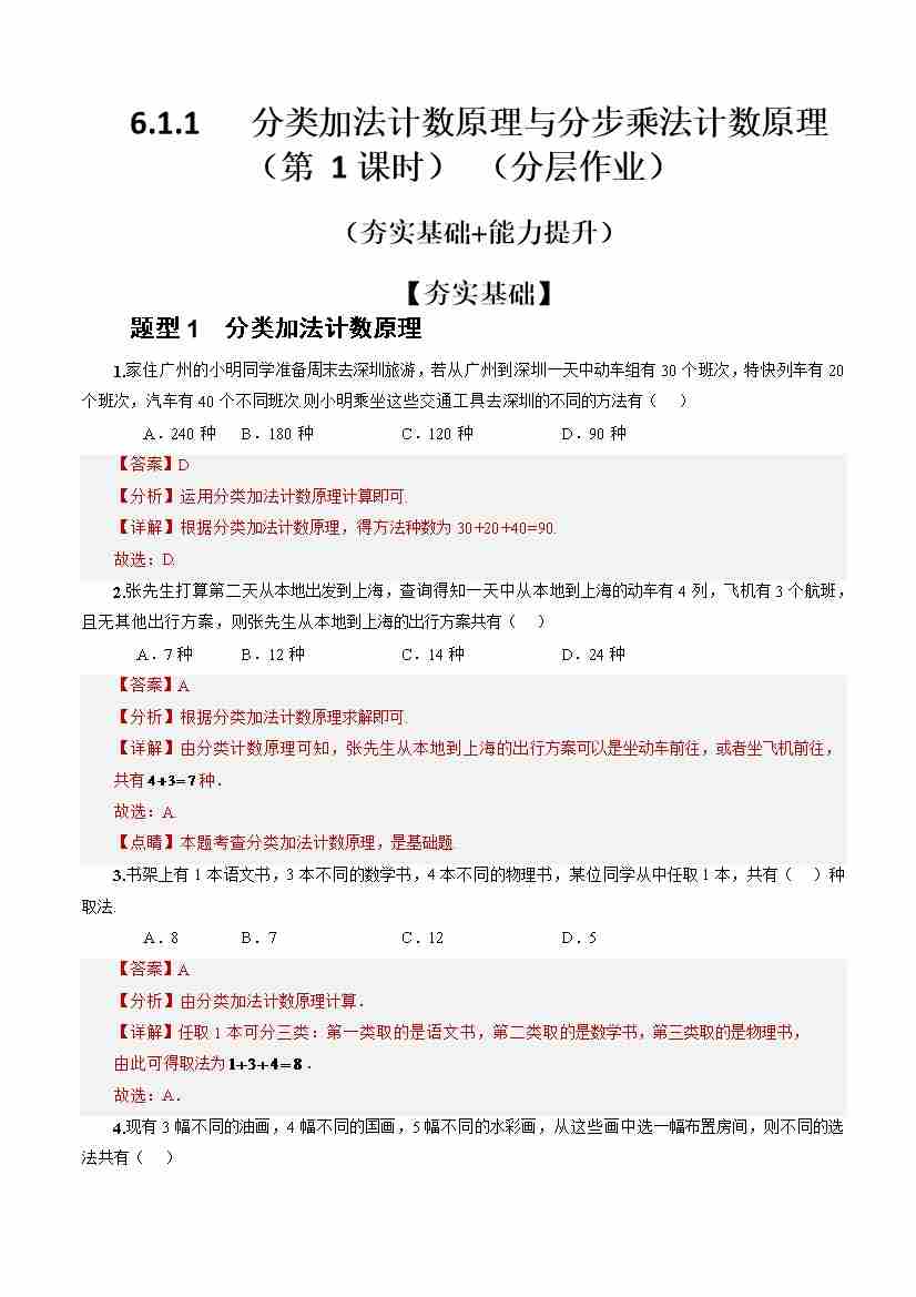 6.1.1 分类加法计数原理与分步乘法计数原理(第1课时)(分层作业)(解析版)-人教A版2019选择性必修第三册)
