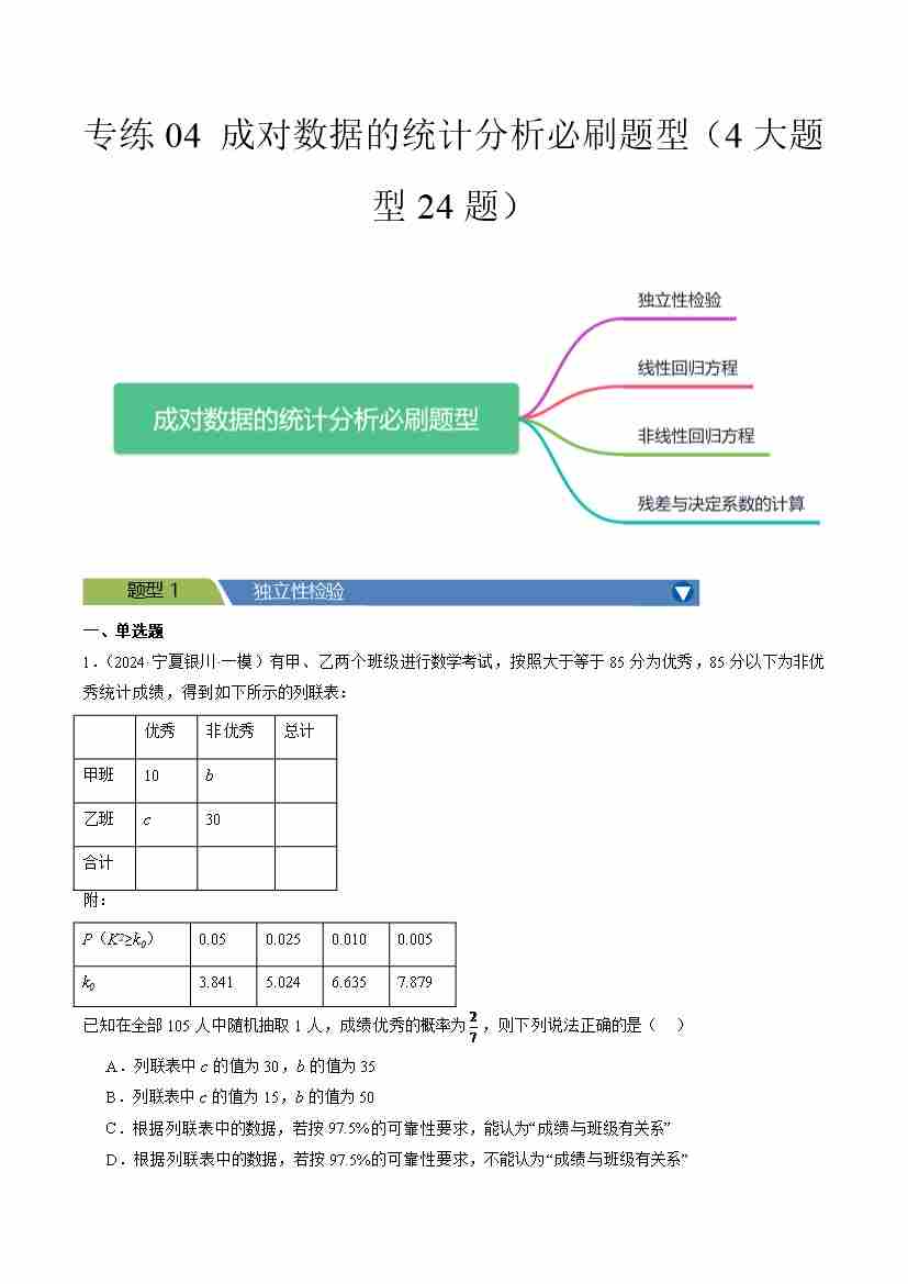 专练04 (最新好题速递)成对数据的统计分析必刷题型(4大题型24题)教师版-(人教A版2019选择性必修第三册)