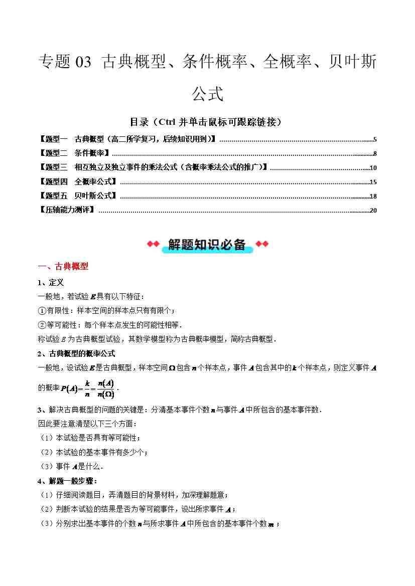 专题03 古典概型、条件概率、全概率、贝叶斯公式(5大压轴考法)教师版