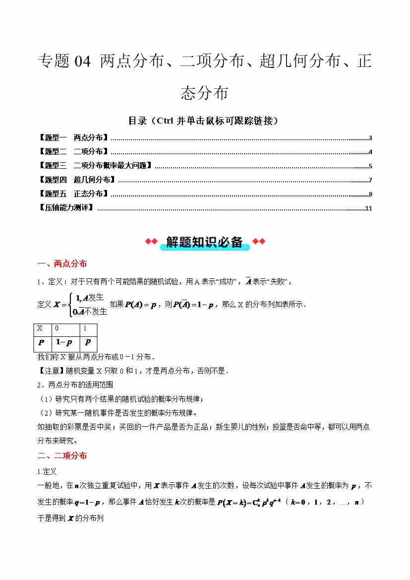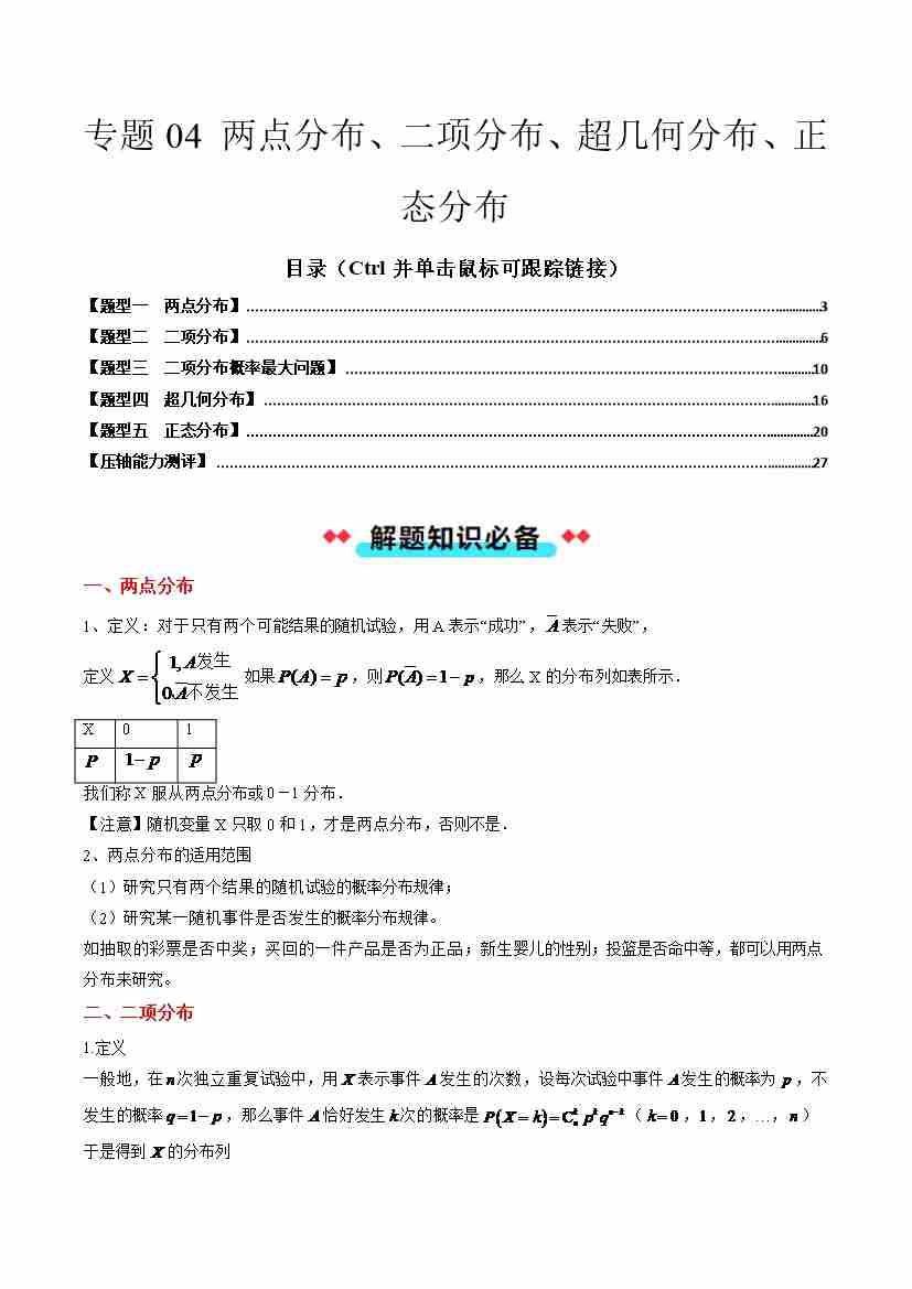 专题04 两点分布、二项分布、超几何分布、正态分布(5大压轴考法)学生版
