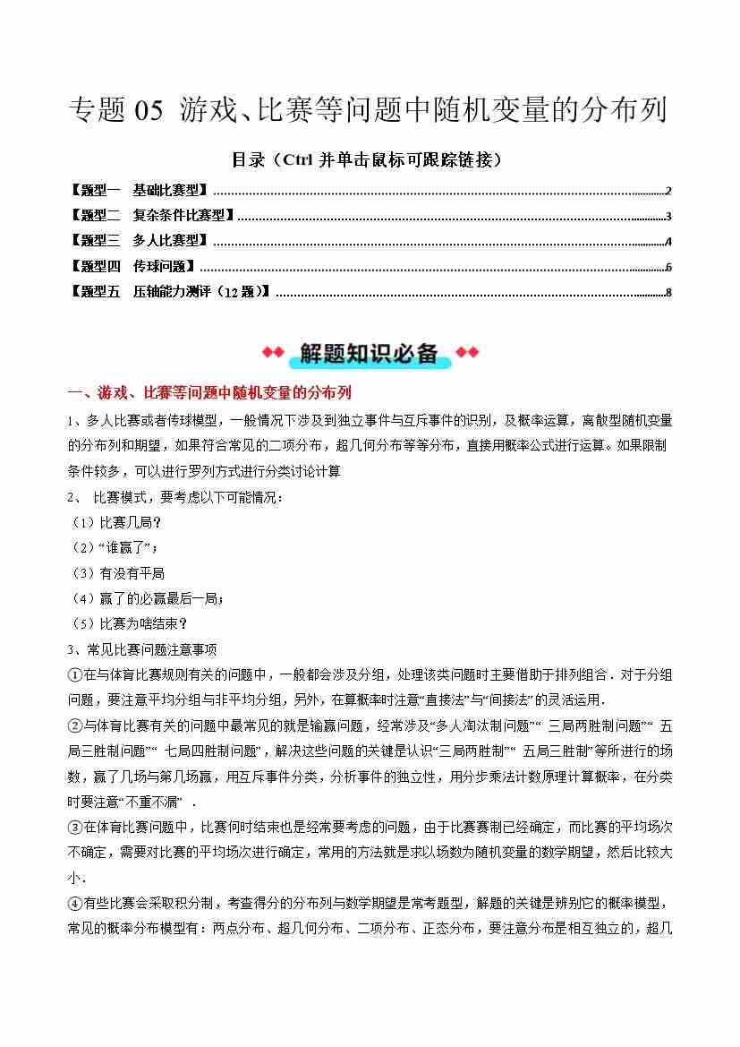 专题05 游戏、比赛等问题中随机变量的分布列(4大压轴考法)教师版