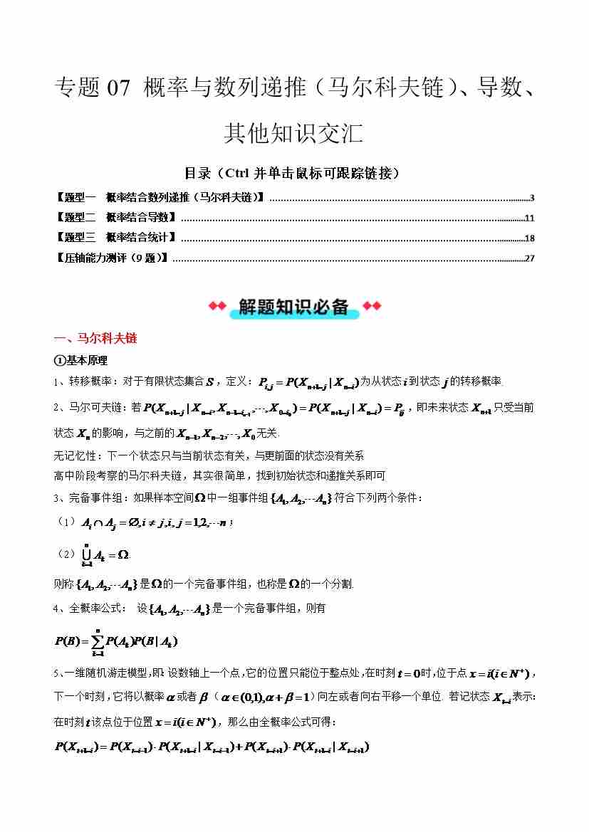 专题07 概率与数列递推(马尔科夫链)、导数、其他知识交汇(3大压轴考法)学生版