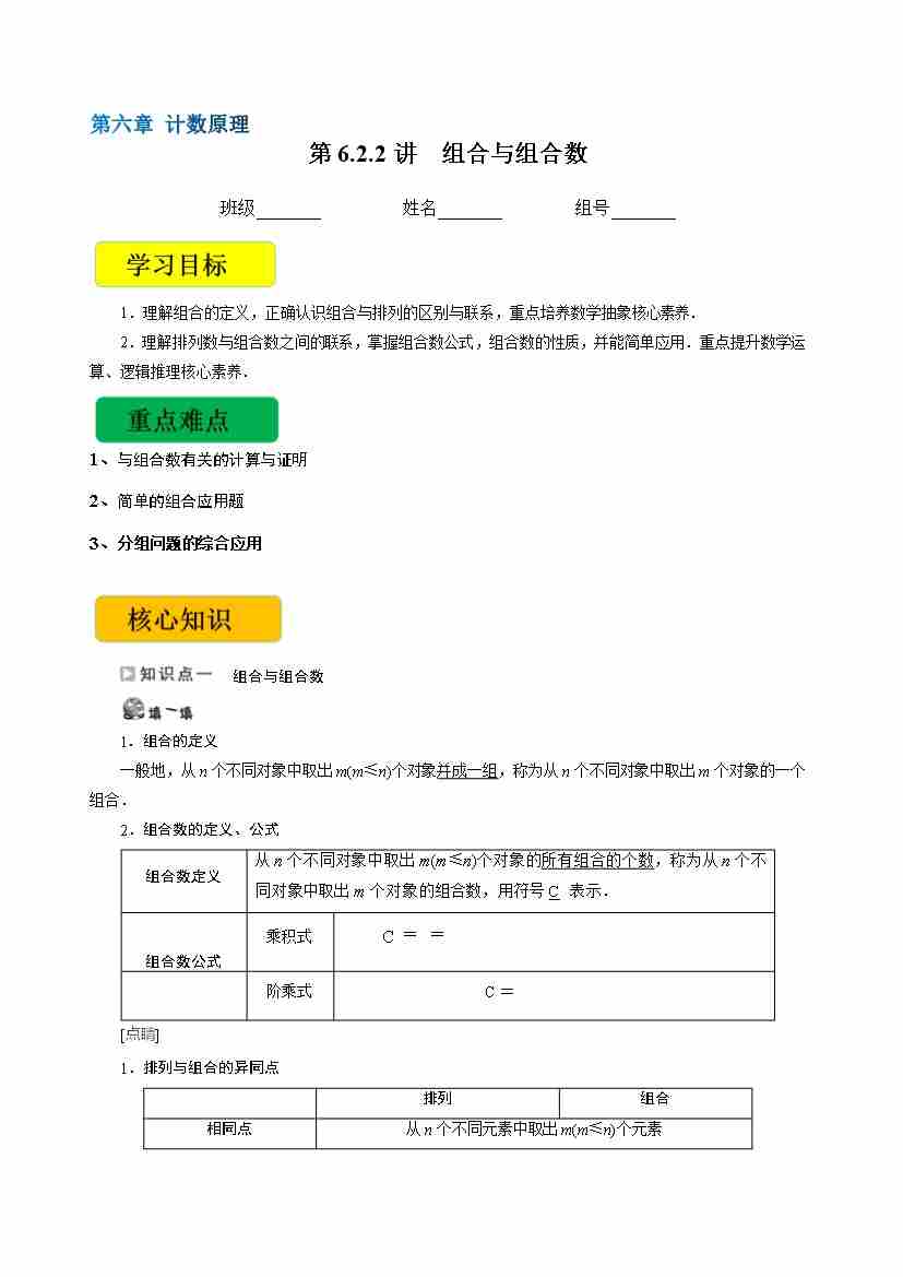 第6.2.2讲 组合与组合数(学生版)人教A版选修第三册)