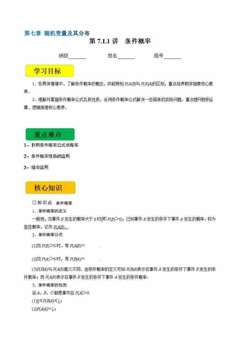 第7.1.1讲 条件概率(学生版)人教A版选修第三册)
