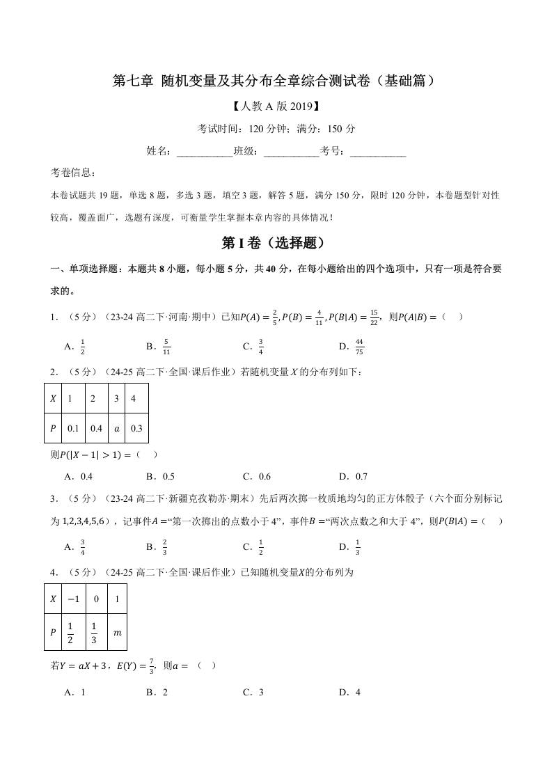 专题7.11 随机变量及其分布全章综合测试卷(基础篇)(人教A版2019选择性必修第三册)(学生版)