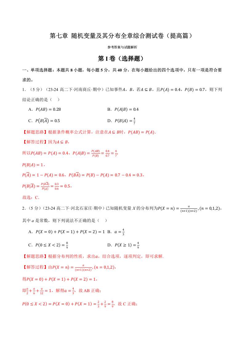 专题7.12 随机变量及其分布全章综合测试卷(提高篇)(人教A版2019选择性必修第三册)(教师版)