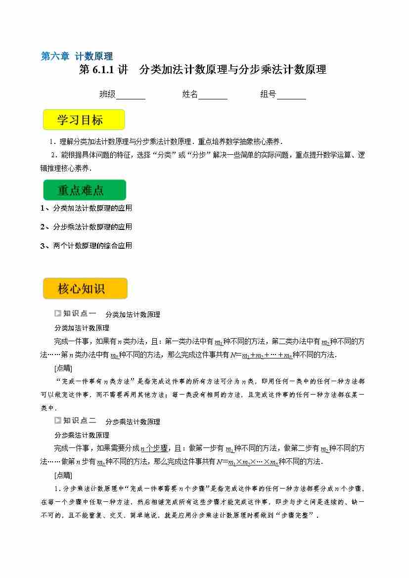 第6.1讲 分类加法计数原理与分步乘法计数原理(学生版)