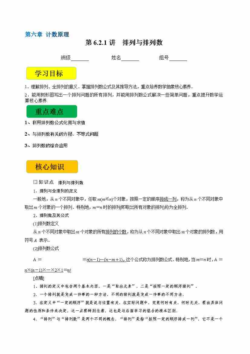 第6.2.1讲 排列与排列数(学生版)