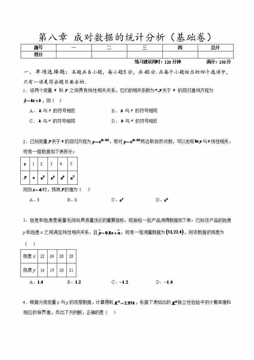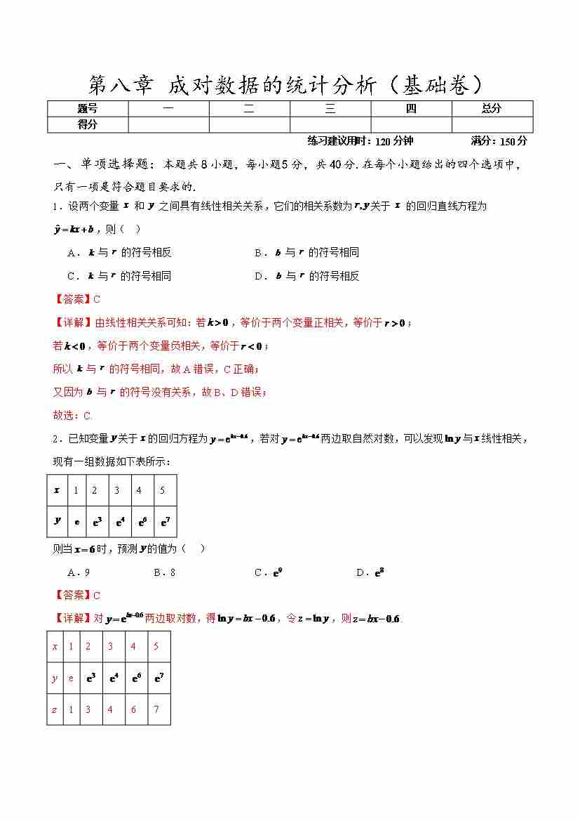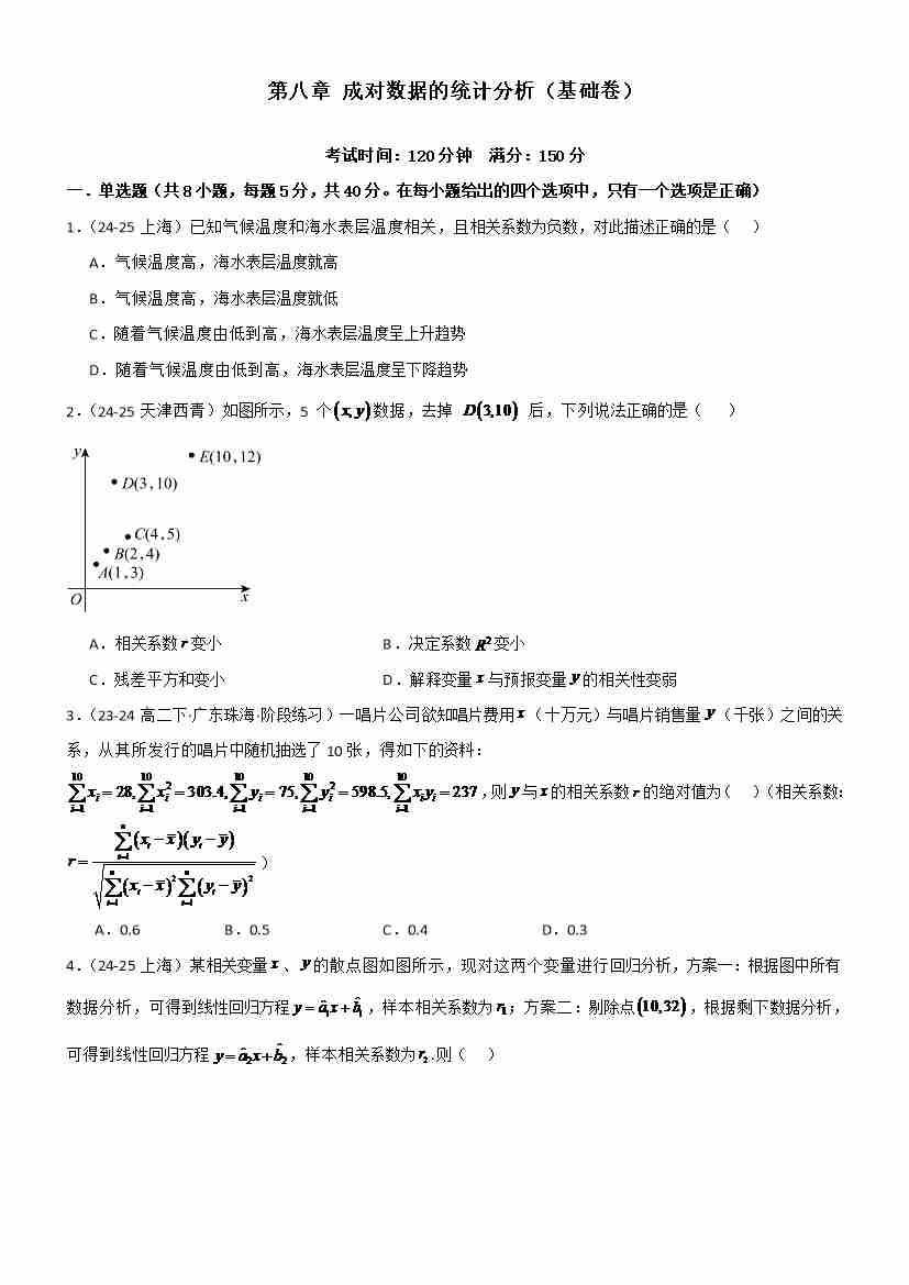 第八章 成对数据的统计分析(基础卷)(学生版)