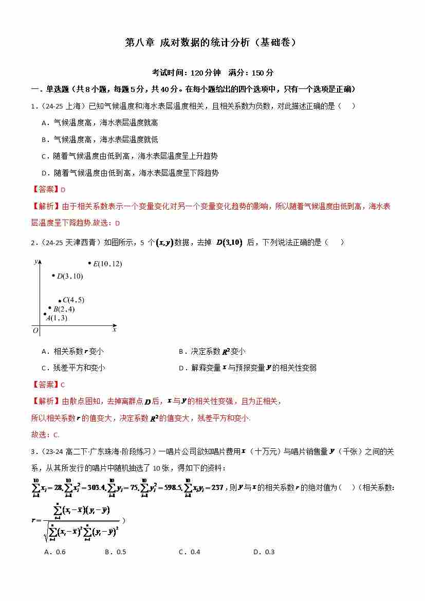 第八章 成对数据的统计分析(基础卷)(教师版)