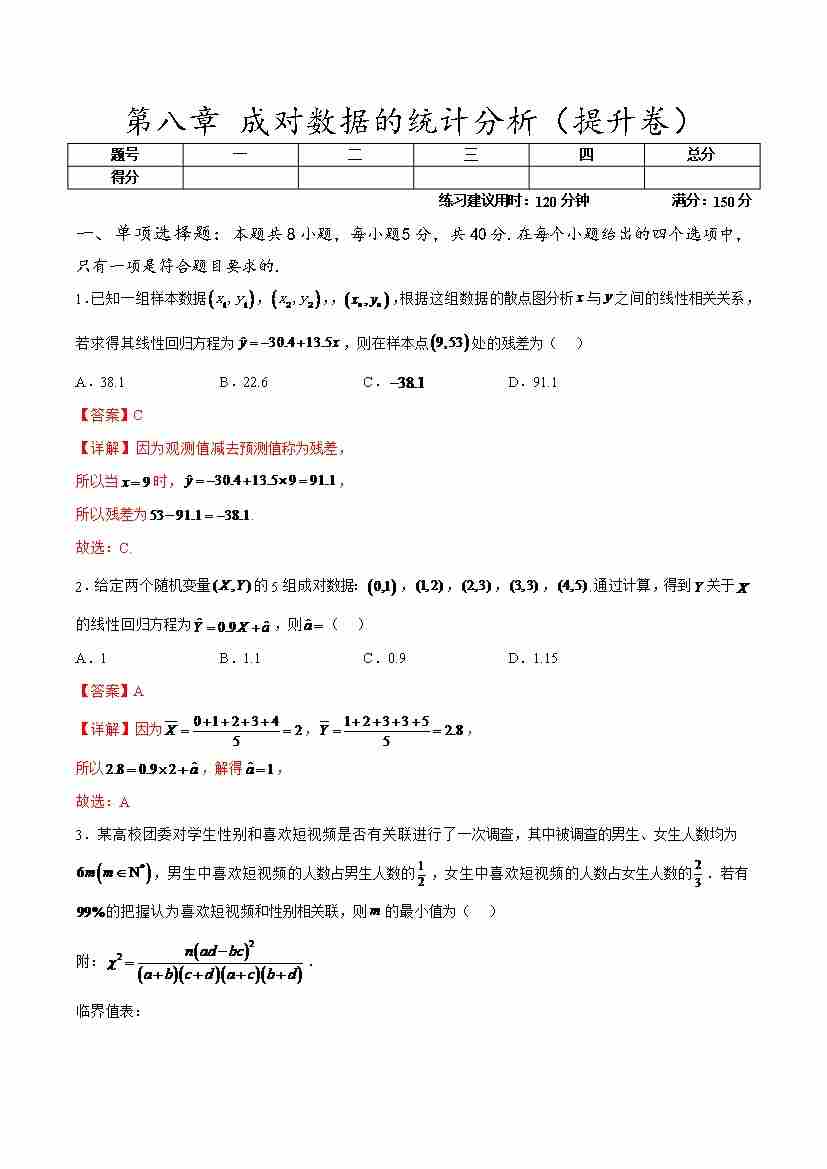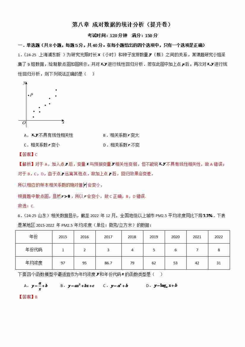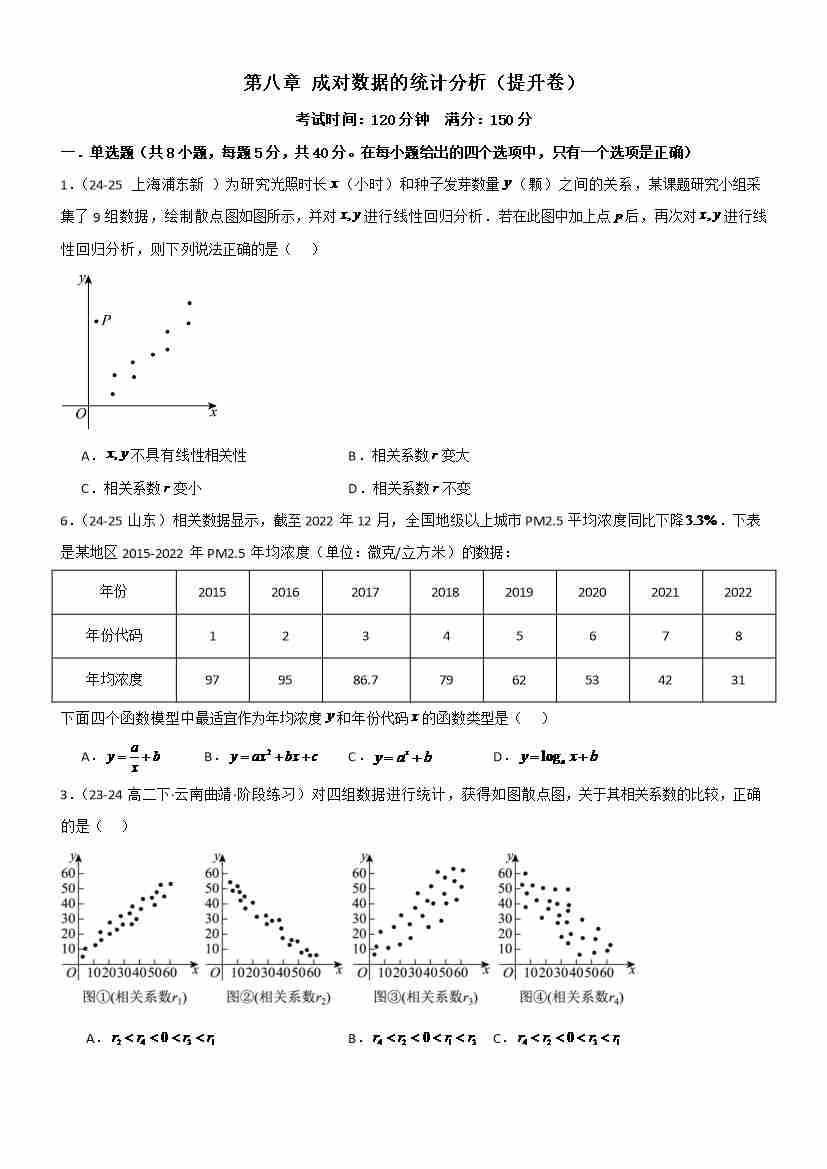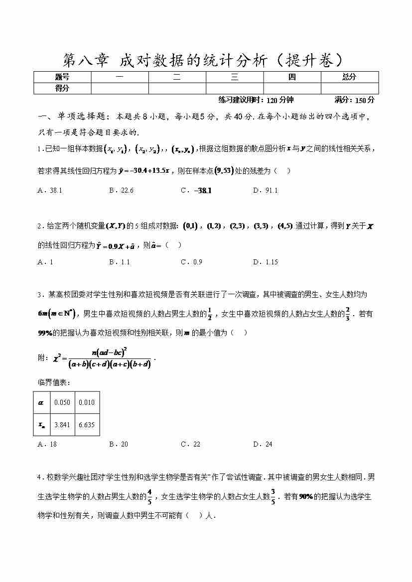 第八章 成对数据的统计分析章末测试(提升卷)(学生版)