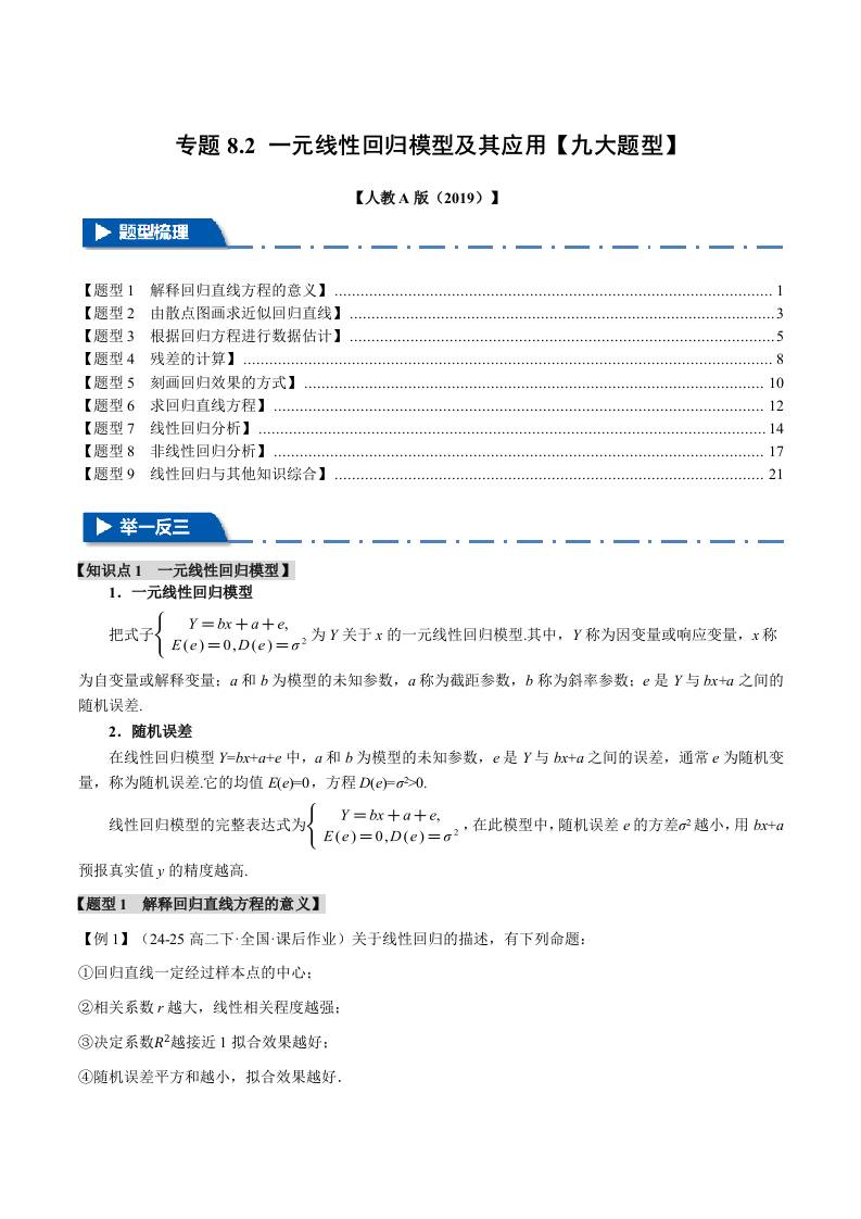 专题8.2 一元线性回归模型及其应用(九大题型)(举一反三)(人教A版2019选择性必修第三册)(学生版)