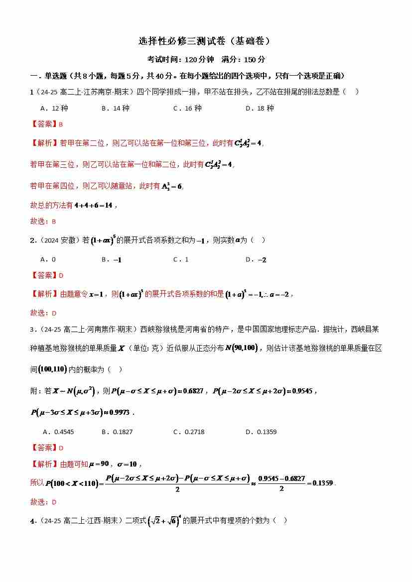 选择性必修三测试卷(基础卷)(教师版)