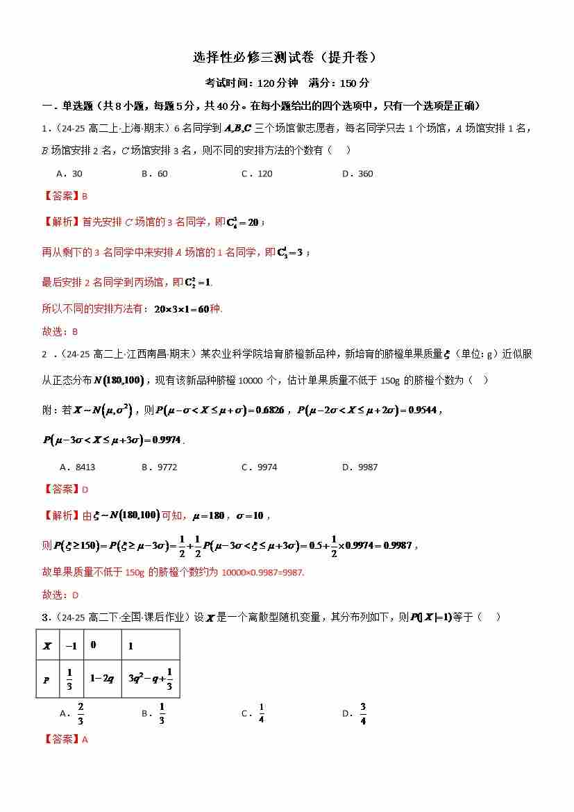 选择性必修三测试卷(提升卷)(教师版)